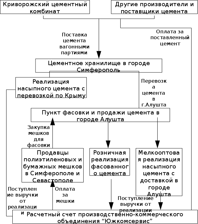 Рис. 2.1. Схема осуществления закупки и реализации цемента производственно-коммерческого объединения “Южкомсервис”. Объединение является официальным дилером Криворожского цементного комбината по Крыму, а также имеет договорные отношения с другими поставщиками цемента юго-восточных областей Украины. Для железнодорожных перевозок используются услуги Приднепровской железной дороги, а в качестве основного автоперевозчика выступает один из учредителей объединения - общество с ограниченной ответственностью “Форма”. В течение летнего сезона объединением осуществляется также закупка продовольственных товаров и их последующая реализация в гостиницы, пансионаты, детские лагеря, базы отдыха, санатории и другие предприятия санаторно-курортного типа. В ассортимент таких товаров в основном входят: мука, овощи и фрукты, консервы, соки и напитки. Основные пики объемов реализации приходятся на следующие периоды: - июнь-сентябрь - реализация продовольственных товаров (в остальное время года объединение не занимается данной группой товаров вообще); - март-май - реализация строительных материалов (это связано с подготовкой к курортному сезону как со стороны курортных предприятий, так и со стороны частного сектора. В остальные месяцы объем реализации несколько ниже и находится на одинаковом уровне). По сфере деятельности данное производственно-коммерческое объединение можно отнести к типу торгово-посреднических предприятий. Прибыль в основном формируется как вознаграждение, получаемое за организацию закупки и доставки названных ранее товаров. Ее валовую величину в общем случае можно высчитать путем уменьшения размера выручки от реализации на величину стоимости закупки товаров, транспортных расходов, расходов на содержание персонала и других издержек. Для анализа финансового состояния в качестве отчетного периода взят 1998 год, формы годовой финансовой отчетности за который и будут использоваться в ходе аналитической работы. По размеру выручки, величине имущества и количеству занятых (5 человек) объединение можно отнести к числу малых предприятий. Общие показатели деятельности объединения приведены в табл. 2.1. Таблица 2.1 Основные показатели деятельности производственно-коммерческого объединения “Южкомсервис” (в грн.)