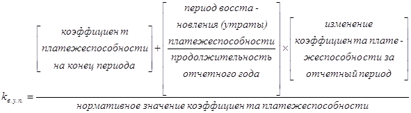 Он определяется как отношение разности между объемами источников собственных средств (реальный собственный капитал) и фактической стоимостью основных средств и прочих внеоборотных активов (итог I раздела актива баланса) к фактической стоимости находящихся в наличии у предприятия оборотных средств в виде производственных запасов, незавершенного производства, готовой продукции, денежных средств, дебиторских задолженностей и прочих оборотных активов (итог II раздела актива баланса). Коэффициент восстановления (утраты) платежеспособности характеризует наличие реальной возможности у предприятия восстановить либо утратить свою платежеспособность в течение определенного периода.[5]
