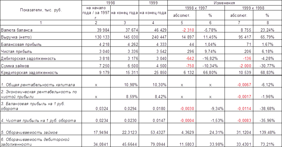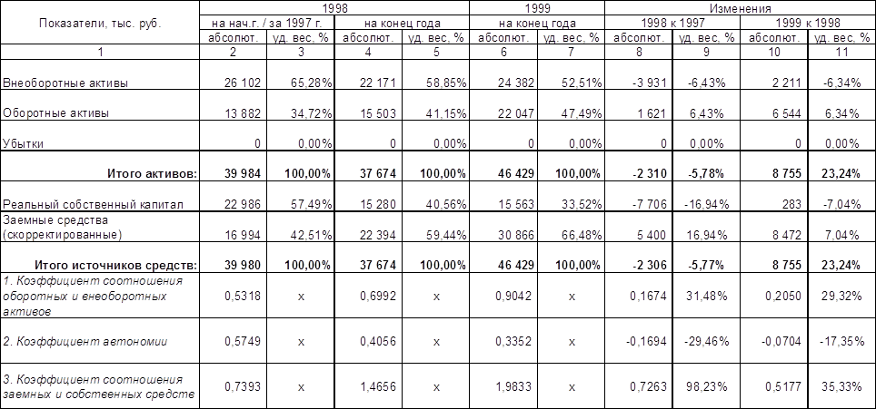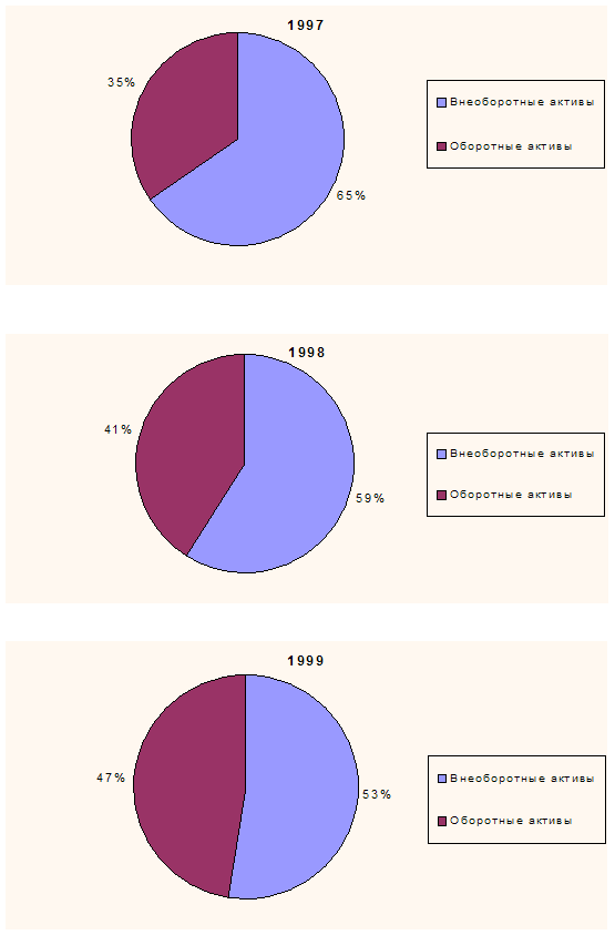 Данный показатель также рассчитывается на начало и конец периода. Нормальным считается если этот коэффициент не меньше 8 (45дней). Из Таблицы 2.1. видно, что предприятие наращивает объем реализации в стоимостном выражении, что само по себе положительно характеризует его деятельность. По сравнению с 1997 г. выручка возросла на 11,45% и составила в 1998 г. 145 030 тыс. руб. При этом величина активов снизилась почти на 6%, что свидетельствует об эффективном использовании имущества. В 1999 г. темп прироста выручки значительно увеличился и составил 65,79% относительно уровня 1998 г. Этому способствовало увеличение активов на 23,24% по сравнению с 1998 г. Для большей сопоставимости показателей выручки необходимо скорректировать их величины в соответствии с индексом инфляции, а также сравнить объемы выпуска (реализации) в натуральных измерителях. На протяжении рассматриваемого периода ОАО «Камчатский Хлеб» работало без убытков, обеспечивая относительно стабильную невысокую величину прибыли. Это обусловливает достаточно низкий уровень рентабельности. На конец 1999 г. общая рентабельность капитала составила 10,30%, при этом экономическая рентабельность по чистой прибыли - только 8,42%. Рентабельность продаж (не отражена в таблице), рассчитываемая по данным формы №2 «Отчет о прибылях и убытках» как отношение прибыли от реализации продукции к полной себестоимости, снизилась с 4,57% в 1997 г. до 3,25% в 1999 г. Также снизились показатели прибыли на 1 руб. оборота, которые составили на конец 1999 г. 1-2 коп. на рубль выручки. Дебиторская задолженность предприятия поддерживалась на достаточно стабильном уровне, имея замедляющуюся тенденцию снижения и сохраняя хорошую оборачиваемость. В то же время резкими, опережающими рост выручки, темпами увеличивалась кредиторская задолженность. В 1998 г. прирост составил 6 132 тыс. руб. или 66,80%, а в 1999 г. - 10 539 тыс. руб. или 68,83%. Доля кредиторской задолженности в общей сумме источников средств увеличилась с 22,96% в начале 1998 г. до 55,68% на конец 1999 г. Тенденция увеличения кредиторской задолженности четко прослеживается на Рис 2.1. на фоне снижения суммы займов, в том числе полном отказе в 1999 г. от долгосрочного кредитования. Очевидно, что данная структура заемных средств крайне рискованна, т.к. ставит предприятие в зависимость от финансового положения своих контрагентов, а также делает его очень чувствительным к изменениям во внешней среде. На лицо резкая разбалансированность дебиторской и кредиторской задолженности. Данные обстоятельства позволяют сделать вывод о высоком риске неплатежеспособности предприятия. Анализ структуры активов проведем на основе данных Таблицы 2.3. В таблице представлены абсолютные величины по видам активов, их удельные веса в общей величине активов, изменения абсолютных величин и удельных весов, значения и изменения коэффициента соотношения оборотных и внеоборотных активов за анализируемый период. Значение данного показателя в большой степени обусловлено отраслевыми особенностями кругооборота средств анализируемой организации. В ходе внутреннего анализа структуры активов следует выяснить причины резкого изменения коэффициента (если это имеет место) за отчетный период. Графически динамика изменения структуры активов ОАО «Камчатский Хлеб» представлена на Рис.2.1. Структуру пассивов, также представленную в Таблице 2