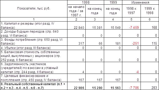При расчете данных коэффициентов следует брать реальный собственный капитал, совпадающий для акционерных обществ с величиной чистых активов. Последние определяются в соответствии с приказом Министерства финансов РФ от 5 августа 1996 г. №71 и Федеральной комиссии по рынку ценных бумаг РФ № 149. Для получения реального собственного капитала организации необходимо итог раздела IV «Капитал и резервы» пассива баланса увеличить на суммы по статьям «Доходы будущих периодов» и «Фонды потребления» из раздела VI «Краткосрочные пассивы» и уменьшить на сумму итога раздела III «Убытки», величину балансовой стоимости собственных акций, выкупленных у акционеров (стр. 252 разд. II баланса), величину задолженности участников (учредителей) по взносам в уставный капитал (стр. 244 разд. II баланса) и сумму по статье «Целевые финансирование и поступления» (стр. 460 разд. IV). Соответственно при расчете коэффициента автономии общая величина источников средств организации образуется как разница итога баланса и суммы итога раздела III «Убытки» актива баланса и величин балансовой стоимости собственных акций, выкупленных у акционеров, и задолженности участников (учредителей) по взносам в уставный капитал, а при расчете коэффициента соотношения заемных и собственных средств скорректированные заемные средства получаются путем увеличения суммы итогов разделов V «Долгосрочные пассивы» и VI «Краткосрочные пассивы» на величину статьи «Целевые финансирование и поступления» (стр. 460 разд. IV) и уменьшения на суммы по статьям «Доходы будущих периодов» и «Фонды потребления» из раздела VI «Краткосрочные пассивы». При этом целевые средства в зависимости от сроков, в течение которых они должны быть использованы, относятся к долгосрочным или краткосрочным пассивам. Нормальные ограничения для коэффициентов: В соответствии с Законом РФ «Об акционерных обществах» (ст. 35) для оценки финансовой устойчивости акционерных обществ решающую роль приобретает показатель чистых активов, определяемый как разница суммы активов, принимаемых к расчету, и суммы обязательств, принимаемых к расчету. Активы акционерного общества, принимаемые к расчету, равняются сумме итогов разделов актива баланса I «Внеоборотные активы» и II «Оборотные активы» за вычетом балансовой стоимости собственных акций, выкупленных у акционеров (стр. 252 разд. II баланса), задолженности участников (учредителей) по взносам в уставный капитал (стр. 244 разд. II баланса), а также оценочных резервов по сомнительным долгам и под обесценение ценных бумаг, если они создавались. Обязательства акционерного общества, принимаемые к расчету, равняются сумме итогов разделов пассива баланса V «Долгосрочные пассивы» и VI «Краткосрочные пассивы», увеличенной на суммы целевого финансирования и поступлений (стр. 460 разд. IV баланса) и уменьшенной на суммы доходов будущих периодов (стр. 640 разд. VI баланса) и фондов потребления (стр. 650 разд. VI баланса).[8] Рассчитанные по данному алгоритму чистые активы совпадают для акционерных обществ с показателем реального собственного капитала, который применим и для юридических лиц иных организационно-правовых форм. Согласно п. 4. ст. 35 Закона РФ «Об акционерных обществах», если по окончании второго и каждого последующего финансового года стоимость чистых активов общества оказывается меньше его ус