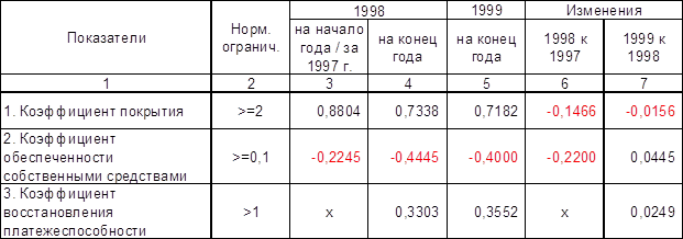 коэффициента: Основным фактором, обусловливающим общую платежеспособность, является наличие у предприятия реального собственного капитала. Постановлением Правительства РФ № 498 от 20 мая 1994 года установлена система критериев для определения неудовлетворительной структуры баланса неплатежеспособных предприятий. В целях обеспечения единого методического подхода при проведении анализа финансового состояния предприятий и оценки структуры их балансов, а также принятии на основе результатов данного анализа решений, определенных постановлением Правительства РФ Федеральным управлением по делам о несостоятельности (банкротстве) утверждены «Методические положения по оценке финансового состояния предприятий и установлению неудовлетворительной структуры предприятия». Показателями для оценки удовлетворительности структуры баланса предприятия являются: коэффициент текущей ликвидности; коэффициент обеспеченности собственными средствами; коэффициент восстановления (утраты) платежеспособности. Коэффициент текущей ликвидности характеризует общую обеспеченность предприятия оборотными средствами для ведения хозяйственной деятельности и своевременного погашения срочных обязательств предприятия и по методике расчета представляет собой коэффициент покрытия, рассмотренный выше. Коэффициент обеспеченности собственными средствами характеризует наличие собственных оборотных средств у предприятия, необходимых для его финансовой устойчивости[5]