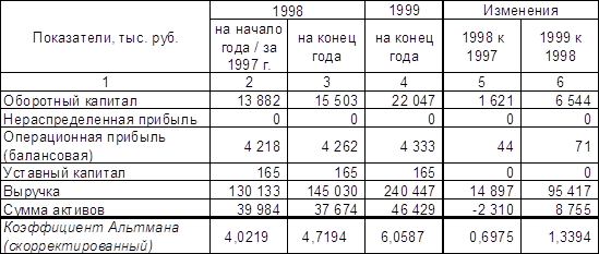 В качестве коэффициента платежеспособности, по которому осуществляется прогноз, в «Методических положениях...» выступает коэффициент покрытия, нормативное значение которого принимается равным 2.[5] Прогноз изменения платежеспособности предприятия можно строить с помощью коэффициента восстановления (утраты) платежеспособности также на основе значений коэффициентов абсолютной ликвидности, уточненной (текущей) ликвидности, общей платежеспособности и их нормативных значений. При этом возможны вариации продолжительности периода восстановления (утраты) платежеспособности в зависимости от целей анализа. Основанием для признания структуры баланса предприятия неудовлетворительной, а предприятия - неплатежеспособным является выполнение одного из следующих условий:[5] коэффициент текущей ликвидности на конец отчетного периода имеет значение менее 2; коэффициент обеспеченности собственными средствами на конец отчетного периода имеет значение менее 0,1. При наличии данных оснований, в случае, если коэффициент восстановления (утраты) платежеспособности, определенный исходя из значения периода восстановления платежеспособности, равного шести месяцам, и установленного значения коэффициента текущей ликвидности, равного двум, имеет значение больше единицы, может быть принято решение о наличии реальной возможности у предприятия восстановить свою платежеспособность.[5] При отсутствии установленных оснований для признания структуры баланса неудовлетворительной, в случае, если коэффициент восстановления (утраты) платежеспособности, определенный исходя из значения периода утраты платежеспособности, равного трем месяцам, и установленного значения коэффициента текущей ликвидности, равного двум, имеет значение меньше единицы, может быть принято решение о том, что предприятие в ближайшее время не сможет выполнить свои обязательства перед кредиторами (об утрате платежеспособности предприятия).[5] Вероятность банкротства предприятия – это одна из оценочных характеристик текущего состояния и обстановки на исследуемом предприятии. Проводя анализ вероятности ежемесячно, руководство предприятия или технологической цепочки может постоянно поддерживать вероятность на низком уровне. Поскольку вероятность зависит от ряда показателей, то для положительного результата необходимо следить не за каким-то одним, а за несколькими основными показателями одновременно.[15] Показатель вероятности банкротства получил название коэффициента Альтмана (индекс кредитоспособности) по имени своего создателя. Индекс кредитоспособности построен с помощью аппарата мультипликативного дискриминантного анализа (Multiple-discriminant analysis - MDA) и позволяет в первом приближении разделить хозяйствующие субъекты на потенциальных банкротов и небанкротов[25]. При построении индекса Альтман обследовал 66 предприятий, половина которых обанкротилась в период между 1946 и 1965 гг., а половина работала успешно, и исследовал 22 аналитических коэффициента, которые могли быть полезны для прогнозирования возможного банкротства. Из этих показателей он отобрал пять наиболее значимых и построил многофакторное регрессионное уравнение. Таким образом, индекс Альтмана представляет собой функцию от некоторых показателей, характеризующих экономический потенциал предприя