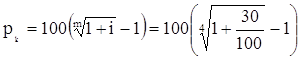 где Kn – номинальная величина векселя; d – число дней от момента дисконтирования до даты погашения векселя; D – процентный ключ или дивизор (D = 3600/p = 36000/8 = 4500). Дисконтированная величина векселя равна разности номинальной стоимости векселя и дисконта (процентного платежа): 20000 – 409 = 19591. Задача 5. Пусть в банк вложено 20000 д.е. под 10% (d) годовых. Найти конечную сумму капитала, если расчетный период составляет: а) 3 месяца; б) 1 месяц. Решение При декурсивном (d)расчете сложных процентов: Kmn = K×Ip/mmn, Ip/m = 1 + p/(100×m), где Kmn – конечная стоимость капитала через n лет при p% годовых и капитализации, проводимой m раз в год. а) K = 20000×I2.54 = 20000×(1 + 10/(100×4))4 = 20000×1.104 = 22076 д.е. б) K = 20000×I10/1212 = 20000×(1 + 10/(100×12))12 = 20000×1.105 = 22094 д.е. При антисипативном (a) способе расчета сложных процентов: Kmn = K×Iq/mmn, Iq/m = 100m/(100m - q), где q – годовой прцент. а) K = 20000×(100×4/(100×4 – 10))4 = 20000×1.107 = 22132 д.е. б) K = 20000×(100×12/(100×12 – 10))12 = 20000×1.106 = 22132 д.е. Задача 6. Номинальная годовая ставка – 30%. Найти уравнивающую процентную ставку при начислении сложных процентов каждые 3 месяца. Решение