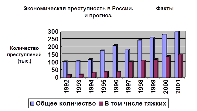 Законодательством также определены формы взаимодействия органов КРУ с правоохранительными органами в целях усиления эффективности контроля, что имеет особо важное значение в связи с ростом преступности в экономической сфере. Сегодня в России объем теневой экономики составляет 45 % ВВП страны. Все активнее криминальные структуры протекают в легальную экономику и финансовую систему. Невиданный размах приняли преступления в сфере внешнеэкономической деятельности. На приведенной ниже диаграмме можно проследить фактический рост экономической преступности в России с прогнозом до 2001 года. Ситуация покажется малоутешительной.