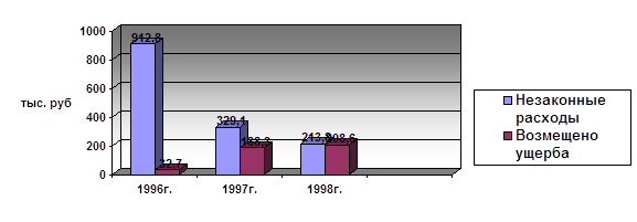 2, 3 Годовые отчеты КРУ МФРФ по г. Бузулуку о проделанной работе за 1996, 1997, 1998 годы. В 1996 году отделом проведено 28 проверок , в том числе по средствам федерального бюджета 5. Общая сумма незаконных расходов составила 912,8 тыс. руб. в том числе по федеральному бюджету – 71,6 тыс. руб. В 1997 году проведено 19 проверок, сумма незаконных расходов составила 329,1 тыс. руб. в том числе по федеральному бюджету – 3,1 тыс. руб. В 1998 году проведено 23 проверки, сумма незаконных расходов составила 213,8 тыс. руб. в том числе по федеральному бюджету – 6,2 тыс. руб. При этом сумма возмещенного ущерба составила: 1996 году – 32,7 тыс. руб. 1997 году – 188,3 тыс. руб. 1998 году – 208,6 тыс. руб. из них по федеральному бюджету: 1996 году – 16,1 тыс. руб. 1997 году – 2,2 тыс. руб. 1998 году – 6,1 тыс. руб.
