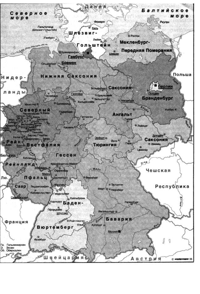 Реферат: ФРН рубежі столітьРеферат: ФРН рубежі столітьМіністерство освіти УкраїниСпеціалізована школа з поглибленим вивченнямнімецької мови № 239 ФЕДЕРАТИВНА РЕСПУБЛІКА НІМЕЧЧИНА На рубежі столітьРоботу виконав Форкош Золтан 11 – А клас Київ – 2002 р. I. ВступЩо ж стоїть за благополуччям цієї багатостраждальної європейської країни? Чи тільки вигідне економіко-географічне положення, сприятливий збіг обставин чи це результат багатовікових шукань німців? Розграбована і розорена після II світової війни країна змогла за кілька десятиліть перетворитися в одну з провідних держав світу. Німеччина - країна індустріальна, країна з безліччю промислових агломерацій, великих і маленьких міст. Але це зовсім не означає, що життя тут повне суєти, що навкруги - одні заводи і фабрики, що димлять труби і вщенд забиті дороги. Багатьом областям Німеччини властиві тиша і спокій, достаток мальовничих пагорбів і річкових пейзажів, а головне, - лісів. Не можна не згадати і культурне життя, що в основному зосереджено у великих містах з їхніми незліченними театрами, концертними залами і музеями, але їм не поступаються і провінції. II. Географічне положення і адміністративно-територіальний поділ Федеративна Республіка Німеччини розташована у центрі Європи. З нею межують дев'ять сусідніх держав: Данія на півночі, Голландія, Бельгія, Люксембург і Франція на заході, Швейцарія й Австрія на півдні, і Чеська Республіка і Польща на сході. Ще чіткіше вимальовується це центральне положення тепер, після відновлення єдності Німеччини 3 жовтня 1990 року. Федеративна Республіка Німеччини є більш ніж коли-небудь, вузловим центром між Сходом і Заходом, так само як і між Скандинавією і регіоном Середземномор`я. Будучи членом Європейського співтовариства і НАТО, Німеччина виконує роль сполучної ланки між державами Центральної і Східної Європи. Територія Німеччини складає 357 000 кв.км. Найбільша довжина з півночі на південь - 876 км, із заходу на схід - 640 км. Крайні точки кордонів: на півночі - селище Лист на острові Зильт, на сході - саксонське село Дешка, на півдні - баварське село Оберстдорф і на заході - селище Зельфкант (Північний Рейн-Вестфалія). Загальна довжина кордону - 3767 км. З 16 федеральних земель 10 - "старих", що не перетерпіли змін: Північний Рейн-Вестфалія, Рейнланд-Пфальц, Саарланд (Саар), Гессен, Баден-Вюртемберг, Баварія, Нижня Саксонія, Шлезвиг-Гольштейн, Гамбург і Бремен (включаючи Бремерхафен, аванпорт Бремена, розташований у 56 км на північ від нього, вниз за течією ріки Везера). На сході Німеччини ліквідовано існуючий в НДР адміністративний поділ на 15 округів, у тому числі Берлін (Східний), що діяв з 1952 року. Відновлено колишні 5 земель, (як продовження колишніх німецьких традицій федералізму): Меклнбург - передня Померанія (центр - Шверин), Брандебург (Потсдам), Саксония-Ангальт, (Магдебург), Саксонія (Дрезден) і Тюрінгія (Ерфурт). окремих випадках, однак, змінені їхня кордони: деякі адміністративні райони (крайси) і громади, виходячи з господарської й іншої доцільності, передані сусіднім землям (див. карту на стор. 14). III. Політичний устрійФРН - країна з однією з найбільш розвинутих у сучасному світі систем парламентської демократії, що забезпечує громадянам широкі можливості волевиявлення і реалізації своїх демократичних прав, закріплених Конституцією. У країні реально з