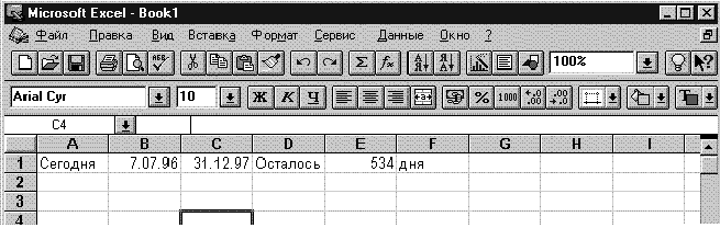 Для быстрого перемещения табличного курсора в ячейку таблицы можно пользоваться командой Goto. вызов которой осуществляется нажатием функциональной клавиши F5. В открывшемся окне в поле Ссылка ввести адрес ячейки, куда должен быть перемещен табличный курсор и нажать Enter. Задание 5. Определить, сколько дней осталось от текущей даты до 31 декабря 1998 года: