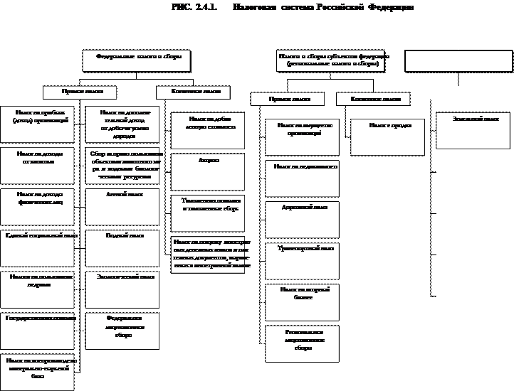 Нередко и прямые, и косвенные налоги подразделяют на несколько видов. Среди прямых налогов выделяют реальные и личные. Реальными налогами облагаются продажа, покупка или владение имуществом, и их взимание не зависит от индивидуальных финансовых возможностей налогоплательщика. К ним, в частности, относятся земельный налог, налог на имущество, налог на недвижимость и некоторые другие. В отличие от реальных, личные налоги учитывают финансовое положение налогоплательщика и его платежеспособность. Они взимаются с физических и юридических лиц или у источника дохода, или по декларации. Примером личного обложения могут служить налог на прибыль, налог на доходы физических лиц. Косвенные налоги, в свою очередь, подразделяются на акцизы, государственную фискальную монополию и таможенные пошлины. Акцизы бывают индивидуальные и универсальные. Ярким примером универсального акциза является налог на добавленную стоимость, который применяется в мировой налоговой системе с конца 60-х – начала 70-х годов, в Российской Федерации – с 1992 г. Индивидуальные акцизы устанавливаются как по отдельным видам товаров, так и по группам товаров. Таможенные пошлины в большинстве стран устанавливаются только на импортные товары. Экспорт товаров, как правило, обложению таможенными пошлинами не подлежит. В отличие от других стран в России установлены и экспортные пошлины. Государственная фискальная монополия в налоговой практике используется не всеми странами, отсутствует она и в российской налоговой системе. На практике нередко проводят разделение налогов в зависимости от их использования. В этом случае они подразделяются на общие и специальные. К общим относится большинство взимаемых в любой налоговой системе налогов. Их отличительной особенностью является то, что они после поступления в бюджет любого уровня обезличиваются и расходуются на цели, определенные в соответствующем бюджете. В отличие от них специальные налоги, имея строго целевое назначение, закреплены за определенными видами расходов. В частности, в Российской Федерации примером специального налога могут служить единый социальный налог, налог на воспроизводство минерально–сырьевой базы. В зависимости от установленных ставок налогообложения налоги подразделяются на пропорциональные, прогрессивные и регрессивные. 2.4 Налоговая система РФ. Особой категорией налогов являются так называемые специальные налоговые режимы. В Налоговом кодексе Российской Федерации предусмотрена возможность установления четырех таких режимов. К специальным налоговым режимам относятся: единый налог на вмененный доход для отдельных видов деятельности, единый налог для сельскохозяйственных товаропроизводителей, система налогообложения при выполнении соглашений о разделе продукции и система налогообложения при разработке неиспользуемых и малодебитных нефтяных скважин. Особенностью этих налогов является то, что со дня их введения на территории соответствующих субъектов Федерации с налогоплательщиков, как правило, прекращается взимание большинства налогов, предусмотренных Налоговым кодексом Российской Федерации.