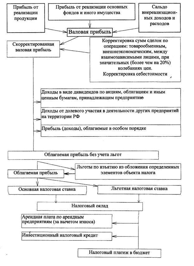*- данные налоги действуют до введения в действие ч.2 Налогового Кодекса РФ НАЛОГ НА ПРИБЫЛЬНалог на прибыль занимает одно из ведущих мест в составе источников формирования бюджетов всех уровней. В соответствии с Законом РФ от 27.12.1991г. №2118-1 «Об основах налоговой системы в Российской Федерации» (с изменениями и дополнениями) налог на прибыль относится к федеральным налогам, следовательно, является общеобязательньм и взимается на всей территории РФ. Налог на прибыль предприятий является прямым личным налогом, взимаемым непосредственно с доходов налогоплательщика. Законодательной и нормативно-правововй базой установления элементов налогообложения по налогу на прибыль являются Закон Российской Федерации от 27.12. 1991 г. N 2116-1 "О налоге на прибыль предприятий и организаций" и Инструкция ГНС РФ от 10.08.1995 г. N 37 «О порядке исчисления и уплаты в бюджет налога на прибыль предприятий и организаций» в редакции последующих Изменений и дополнений. Плательщиками налога на прибыль являются: - предприятия и организации (в том числе бюджетные), являющиеся юридическими лицами по законодательству РФ, включая созданные на территории РФ предприятия с иностранными инвестициями, международные объединения и организации, осуществляющие предпринимательскую деятельность; - коммерческие банки различных видов, включая банки с участием иностранного капитала, и другие кредитные учреждения, получившие лицензию Центрального банка РФ на осуществление отдельных банковских операций, а также Банк Внешней торговли РФ; - ЦБ РФ и его учреждения в части прибыли, полученной от деятельности, не связанной с регулированием денежного обращения; - страховые организации, имеющие лицензию Федеральной службы России по надзору за страховой деятельностью. По предприятиям, в состав которых входят территориально обособленные структурные подразделения, не имеющие отдельного баланса и расчетного (текущего, корреспондентского) счета, расчет суммы налога на прибыль в части, подлежащей зачислению в доходы бюджетов субъектов Российской Федерации по месту нахождения указанных структурных подразделений, производится исходя из доли прибыли, приходящейся на эти структурные подразделения, определяемой пропорционально их среднесписочной численности(или фонду оплаты труда) и стоимости основных производственных фондов в порядке. При этом сумма налога по указанным предприятиям и структурным подразделениям определяется в соответствии со ставками налога на прибыль, действующими на территориях, где расположены эти предприятия и структурные подразделения. Объектом обложения налогом на прибыль является конечный стоимостной результат деятельности хозяйствующего субъекта, т.е. валовая прибыль предприятия, уменьшенная или увеличенная в соответствии с "Инструкцией о порядке исчисления и уплаты в бюджет налога на прибыль предприятий и организаций" №37 от 10.08.95г. с последующими изменениями. Схема формирования объекта обложения и определения налога на прибыль приведена на рис.1. Валовая прибыль представляет собой сумму прибыли (убытка) от реализации продукции (работ, услуг), основных фондов (включая земельные участки), иного имущества предприятия и доходов от внереализационных операций, уменьшенных на сумму расходов по этим операциям.