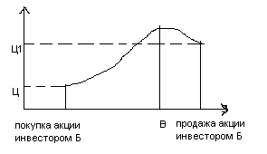 Если инвестиционный период, по которому оцениваются акции, включает выплату дивидендов и заканчивается их реализацией, то доход определяется как совокупные дивиденды с учетом изменения курсовой стоимости, т.е. Д = В1…п + (Ц1-Ц) Таким образом конечный доход после реализации акции может быть любым: Д< О, если В < Ц1-Ц – при условии, что Ц1<Ц и Д>О, если Ц1-Ц<В или величина положительная, если Ц1>Ц. На графике этот инвестиционный период показан на примере инвестора Б (рис.2)