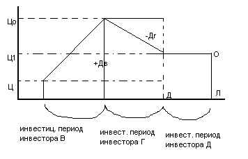 Доходность инвестора Б является конечной (Дхк), так как он реализовал свою ценную бумагу и доходность за инвестиционный период (в пределах года) измеряется соотношением: Дхк=((В + (Ц1-Ц))/Ц) * 100% Если инвестиционный период не включает выплаты дивидендов, то доход образуется кака разница между ценой покупки и продажи. Таким образом, Д=Ц1-Ц и может быть любой величиной – положительной (для инвестора В), отрицательной (для инвестора Г) и нулевой (для инвестора Д). Графически это можно изобразить следующим образом (рис.3):
