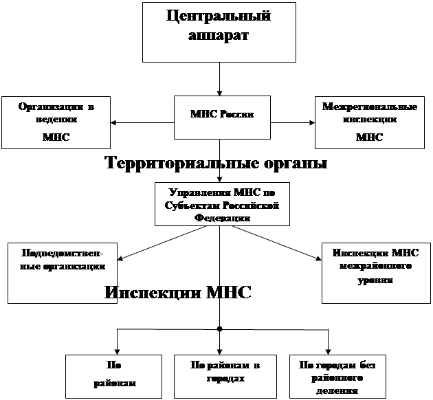 Рис. 1. Система органов Министерства Российской Федерации по налогам и сборам Предусмотрена деятельность специализированной налоговой инспекции МНС России по работе с крупнейшими налогоплательщиками (постановлением Правительства РФ от 06. 01. 98 г.); межрегиональной налоговой инспекции по оперативному контролю проблемных налогоплательщиков1, межрегиональной государственной инспекции МНС России по контролю за налогообложением малого бизнеса и сферы услуг2; межрегиональной инспекции МНС Россия по контролю за алкогольной и табачной продукцией3 Для осуществления взаимодействия министерства с полномочными представителями Президента Российской Федерации в федеральных округах утверждены положение и типовая структура межрегиональных инспекций МНС России по федеральному округу (приказ МНС РФ от 24. 08. 2000 г. № БГ-3-20/307). Налоговые органы - юридические лица. Они имеют самостоятельную смету расходов, текущие счета в учреждениях банков, печати. Подчиненность внутри структуры осуществляется по вертикали: Министерству Российской Федерации по налогам и сборам и его вышестоящим органам. Структура Управлений по субъектам федерации утверждается министерством. Министерством же определяются функции структурных подразделений руководимых налоговых органов. Система налоговых органов построена в соответствии с административным и национально-территориальным делением, принятым в Российской Федерации, и состоит из трех звеньев. Основным элементом в этой системе являются государственные налоговые инспекции по районам, городам без районного деления и районам в городах. Второе звено включает в себя районные (городские) государственные налоговые инспекции. Возглавляет систему налоговых органов центральный аппарат Государственной налоговой службы - Министерство Российской Федерации по налогам и сборам. Высшую ступеньку в иерархии налоговых органов занимает центральный аппарат Министерства Российской Федерации по налогам и сборам, которая является правоприемником Государственной налоговой службы Российской Федерации. Его структурная схема состоит из департаментов по основным направлениям деятельности. 1.1 Департамент налоговой политики 1.2 Департамент налогообложения прибыли 1.3 Департамент косвенных налогов 1.4 Департамент налогообложения доходов и имущества физических лиц 1.5 Департамент единого социального налога 1.6 Департамент организации налогового контроля 1.7 Департамент налогов и сборов с алкогольной и табачной продукции 1.8 Департамент учета налогоплательщиков 1.9 Департамент учета и отчетности 1.10 Департамент анализа и планирования налоговых поступлений 1.11 Департамент контроля налоговых органов 1.12 Департамент информационных технологий 1.14 Департамент кадровой политики 1.15 Департамент финансового обеспечения 1.16 Департамент материального обеспечения и капитального строительства 1.17 Административно-контрольный департамент 1.18 Управление ресурсных платежей 1.19 Управление налогообложения малого бизнеса 1.20 Управление международных налоговых отношений 1.21 Управление по работе с кредитными организациями 1.22 Управление по модернизации налоговых органов 1.23 Управление международного сотрудничества 1.24 Управление по информационной политике 1.25 Управление налоговой задолженности В рамках решения поставленных задач 