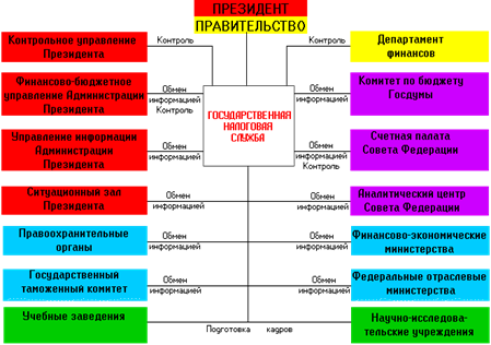 Рис. 2 Взаимодействие Госналогслужбы с министерствами и ведомствами по формированию налоговой политики Взаимодействие можно рассматривать в двух аспектах. В широком смысле - это деловое сотрудничество нескольких государственных органов в обеспечении экономической безопасности в пределах конкретной территории. Такое взаимодействие осуществляется путем разработки и принятия совместных документов (приказов, инструкций, комплексных и целевых программ, договоров, соглашений, планов), которыми определяются приоритетные направления, формы, методы, сроки совместных действий; проведения межведомственных совещаний, семинаров; осуществления согласованных мер по повышению деловой квалификации сотрудников; обмена положительным опытом работы; проведения совместных рейдов, проверок и т.д. Под взаимодействием в узком смысле понимается координация действий подразделений внутренних дел с налоговыми инспекциями, Федеральной службы безопасности, следователем, прокурором в конкретных эпизодах борьбы с экономическими преступлениями, раскрытии налоговых правонарушений и коррупции. Основными задачами взаимодействия являются: выявление, раскрытие и расследование налоговых преступлений; привлечение к установленной законом ответственности лиц, совершивших налоговые преступления и обеспечение полного возмещения материального ущерба, причиненного ими государству; розыск лиц, совершивших налоговые преступления и скрывшихся от следствия и суда; профилактика налоговых правонарушений; выявление и пресечение фактов коррупции в налоговых органах и подразделениях налоговой полиции, обеспечение безопасности деятельности сотрудников этих служб; повышение деловой квалификации кадров. Правовую основу взаимодействия составляют: уголовно-процессуальный кодекс России, Указы Президента РФ, ведомственные (межведомственные) приказы и инструкции, а также межведомственные договоры и соглашения. В процессе взаимодействия стороны должны исходить из ряда общих положений (принципов). Важнейшими из них являются: соответствие совместной деятельности требованиям закона и подзаконных актов. Стороны не могут решать задачи, запрещенные соответствующими нормативными актами, выходить за пределы своей компетенции, использовать формы, средства и методы, не предусмотренные законом; самостоятельность каждой из сторон в выборе дозволенных законом средств и методов деятельности, в частности оперативно-розыскных, и полная ответственность за их результаты. Взаимодействие не должно приводить к командованию, а тем более подмене одного органа другим; взаимное доверие сторон при строгом соблюдении каждой из них государственной и служебной тайн, неразглашении иных сведений, охраняемых законом. Стороны должны обеспечивать, необходимую конфиденциальность, не допускать разглашения сведений о совместных мероприятиях, используемых силах и средствах, сохранять и, в установленном порядке, использовать полученную информацию и материалы. Любую информацию, затрагивающую интересы другой стороны, передавать иным организациям только по согласованию с нею; непрерывность взаимодействия. Сторонам целесообразно согласовывать перспективное и текущее планирование по конкретным направлениям совместной деятельности, объектам налогообложения, уголовным 