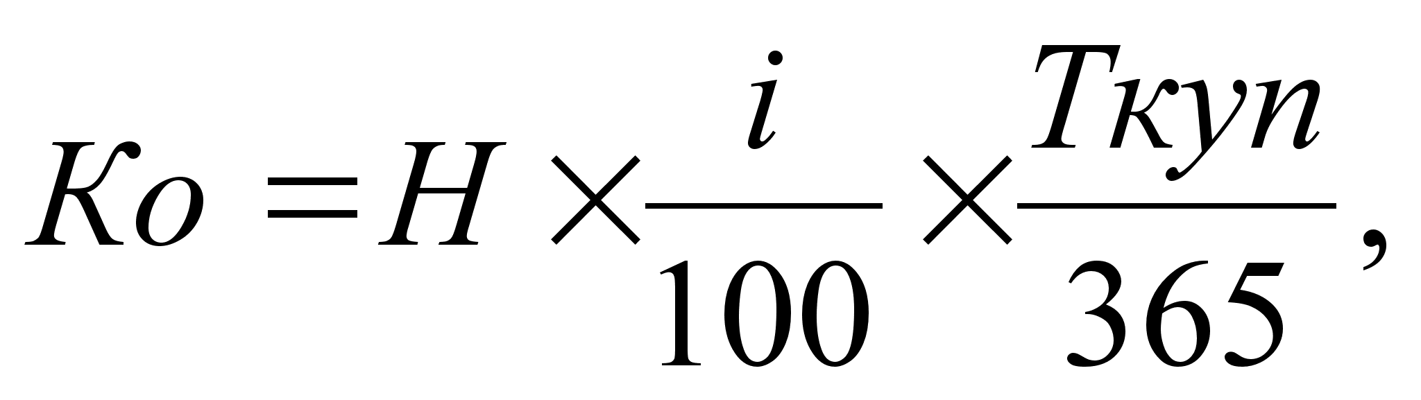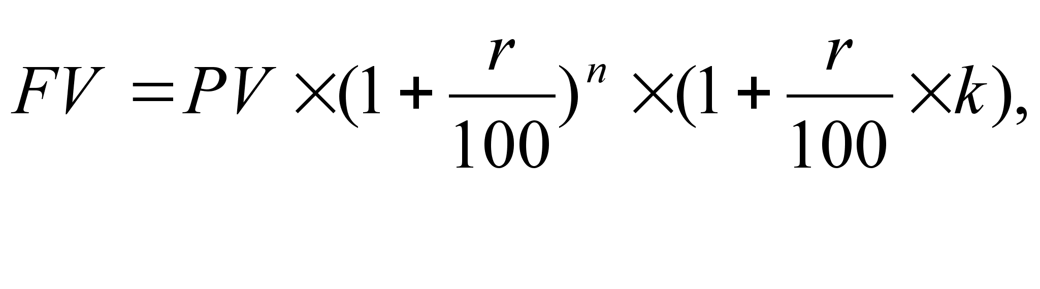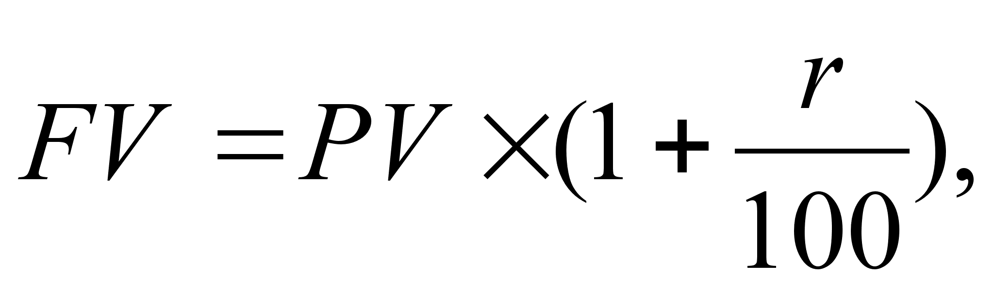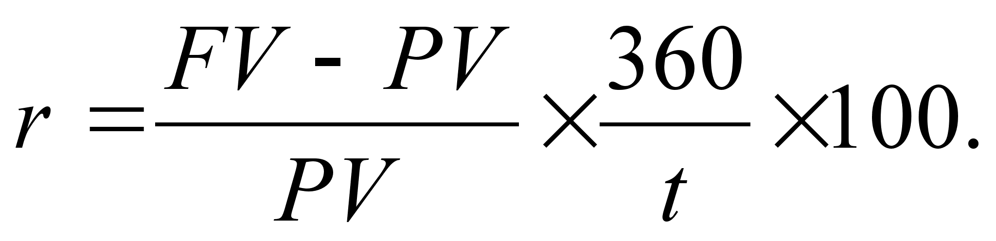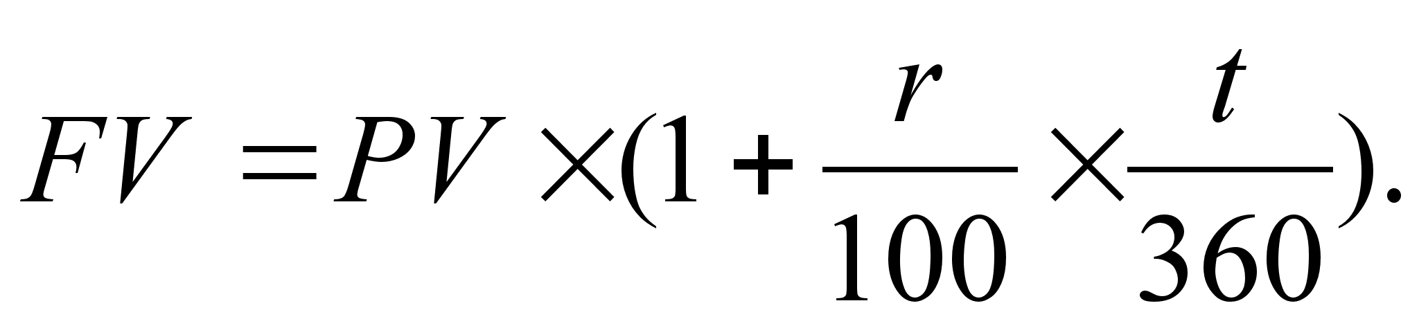 Для описания финансовых расчетов будем применять обозначения, которые использовались ранее, в частности: r – годовая процентная ставка (процент); PV – сумма активов в начальный период (база начисления); FV – сумма активов в конечный период; t – количество дней (временной интервал). Тогда формула расчета по методу наращения будет выглядеть так: