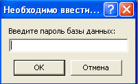 В нашей базе данных был применен первый способ защиты. Данный способ заключается он в следующем: при запуске приложения появляется диалоговое окно на введение пароля доступа (Рисунок 2). При введение неверного пароля доступ в БД запрещается и предлагается ещё раз ввести пароль БД, при введении же верного пароля доступ в БД открыт. Рисунок 2 – Диалоговое окно ввода пароля БД