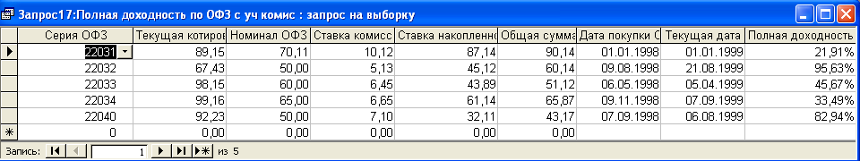 SELECT [Реальная доходность ГКО с уч врем лагов].Серия_ГКО, [Реальная доходность ГКО с уч врем лагов].Цена_покупки, [Реальная доходность ГКО с уч врем лагов].Время_вывод_средств, [Реальная доходность ГКО с уч врем лагов].Ставка_комис_вознагр, [Реальная доходность ГКО с уч врем лагов].Дата_вложения, [Реальная доходность ГКО с уч врем лагов].Дата_погашения, (100-[Цена_покупки]*(1+[Ставка_комис_вознагр]/100))/([Цена_покупки]*(1+[Ставка_комис_вознагр]/100))*365/([Дата_погашения]-[Дата_вложения]+[Время_вывод_средств]) AS [Реальная доходность с ГКО с уч вр лагов] FROM [Реальная доходность ГКО с уч врем лагов]; Результатом работы данного запроса является расчет реальной доходности ГКО с учетом временных лагов (см. п. п. 1.4.3 (30)). Результат работы запроса приведен в Приложении Б.6. Запрос 7– Полная доходность по ОФЗ с учетом комиссионных