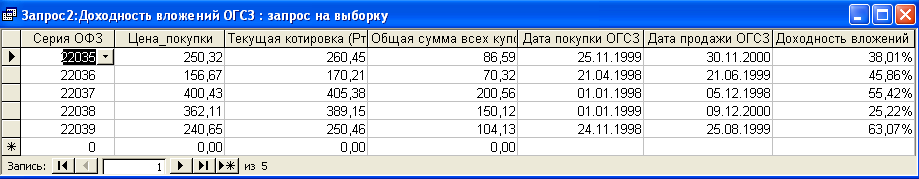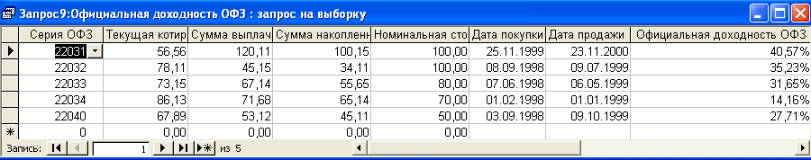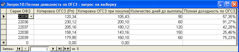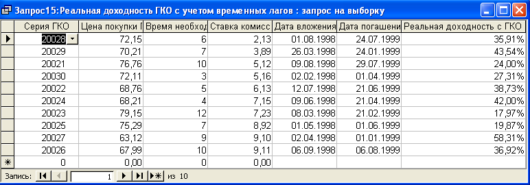 SELECT [Доходность вложений по ОГСЗ].Серия_ОФЗ, [Доходность вложений по ОГСЗ].Цена_покупки, [Доходность вложений по ОГСЗ].Котировка, [Доходность вложений по ОГСЗ].Общ_сумма, [Доходность вложений по ОГСЗ].Дата_покупки, [Доходность вложений по ОГСЗ].Дата_продажи, ((([Котировка]-[Цена_покупки])+[Общ_сумма])/[Цена_покупки])*365/([Дата_продажи]-[Дата_покупки]) AS [Доходность вложений по ОГСЗ] FROM [Доходность вложений по ОГСЗ]; Результатом работы данного запроса является расчет доходности вложения по ОГСЗ (см. п.п. 1.3.2 (28)). Результат работы запроса приведен в Приложении Б.8. Запрос 9– Доходность вложения по ОФЗ