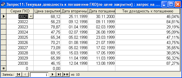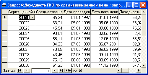 SELECT [Доходность вложения в ОФЗ].Серия_ОФЗ, [Доходность вложения в ОФЗ].Тек_котировка, [Доходность вложения в ОФЗ].Цена_покупки_ОФЗ, [Доходность вложения в ОФЗ].Номинал, [Доходность вложения в ОФЗ].Сумма_накопл_дох, [Доходность вложения в ОФЗ].Сумма_упл_дох, [Доходность вложения в ОФЗ].Общ_сумма, [Доходность вложения в ОФЗ].Дата_покупки, [Доходность вложения в ОФЗ].Дата_продажи, ((([Тек_котировка]-[Цена_покупки_ОФЗ])*([Номинал]/100)+([Сумма_накопл_дох]-[Сумма_упл_дох]+[Общ_сумма]))/([Цена_покупки_ОФЗ]*([Номинал]/100)+[Сумма_упл_дох]))*365/([Дата_продажи]-[Дата_покупки]) AS [Доходность вложения по ОФЗ] FROM [Доходность вложения в ОФЗ]; Результатом работы запроса является расчет доходности вложений по ОФЗ (см. п.п. 1.3.2 (27)). Результат работы запроса приведен в Приложении Б.9. Запрос 10 – Доходность ГКО по средневзвешенной цене