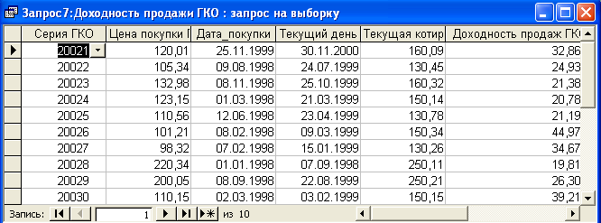 SELECT [Доходность покупки ГКО].Серия_ГКО, [Доходность покупки ГКО].Цена_приобр, [Доходность покупки ГКО].Дата_покупки, [Доходность покупки ГКО].Дата_продажи, ((100-[Цена_приобр])/[Цена_приобр])*365/([Дата_продажи]-[Дата_покупки]) AS [Доходность покупки ГКО] FROM [Доходность покупки ГКО]; Результатом работы запроса является вычисление доходности покупки ГКО (см. п.п. 1.3.1 (19)). Результат работы запроса приведении в Приложении Б.12. Запрос 13– Доходность продажи ГКО