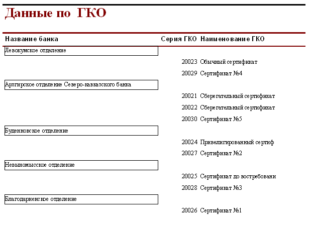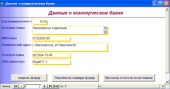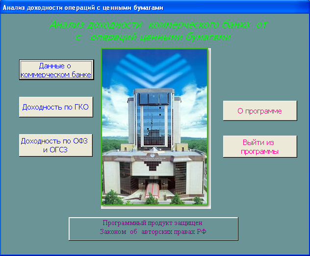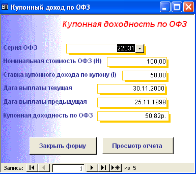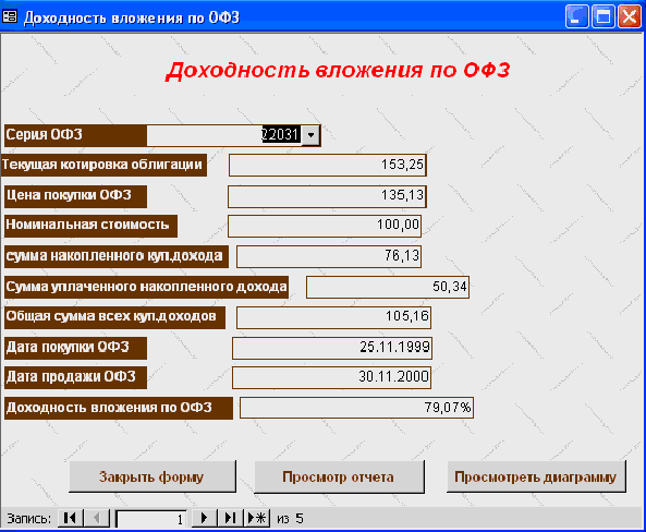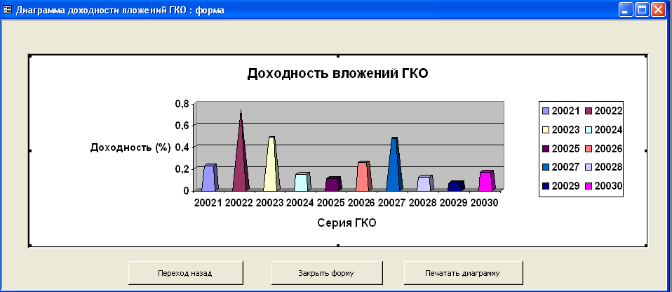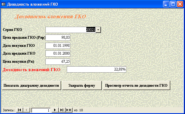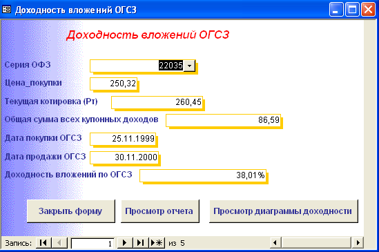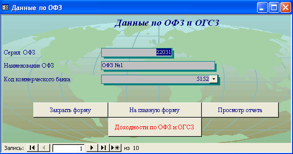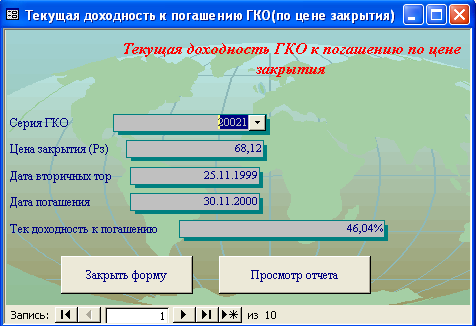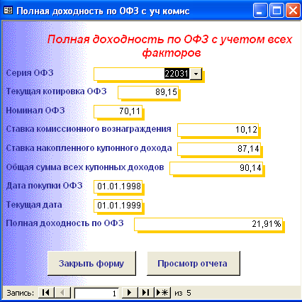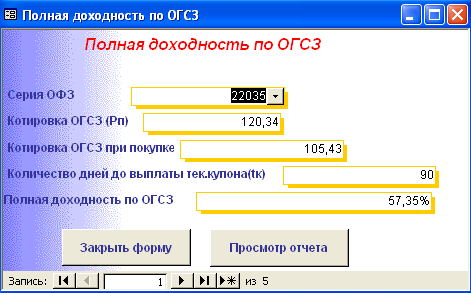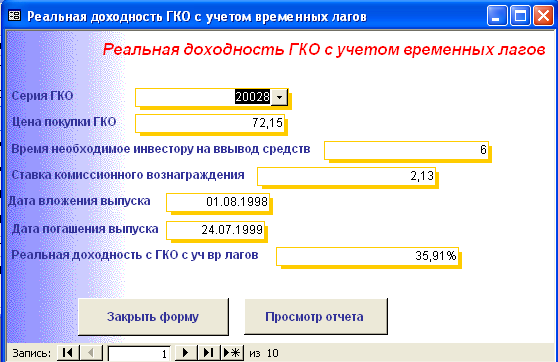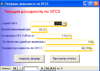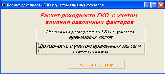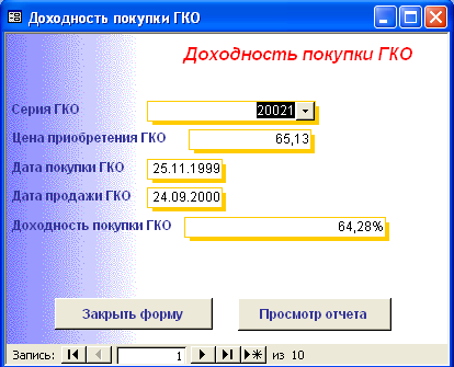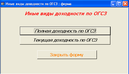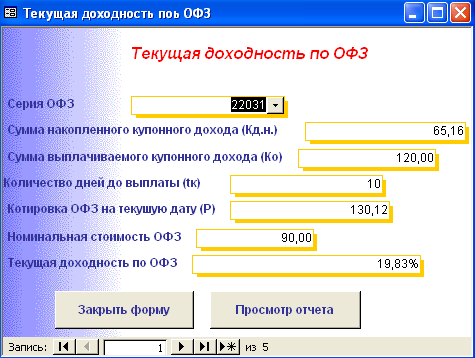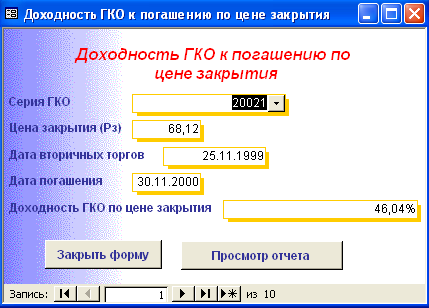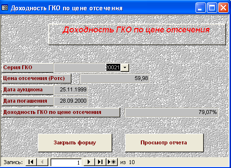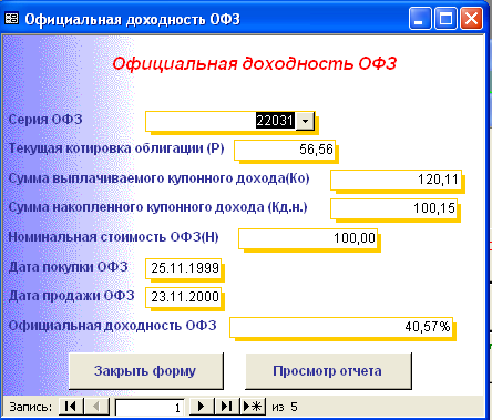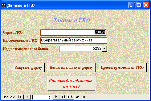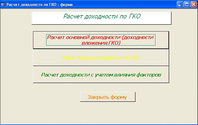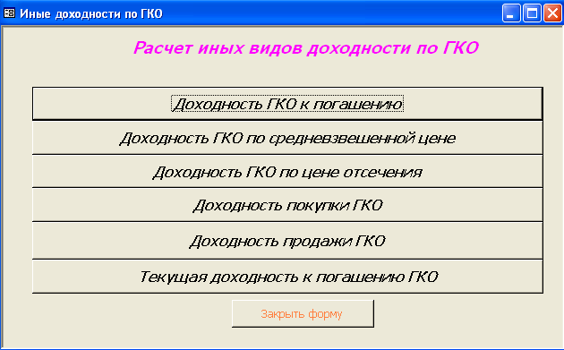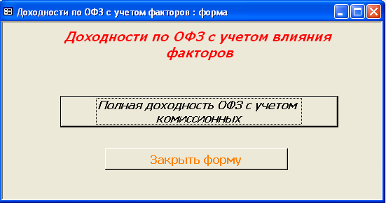 SELECT [Официальная доходность ОФЗ].Серия_ОФЗ, [Официальная доходность ОФЗ].Тек_котировка, [Официальная доходность ОФЗ].Сумма_выпл_куп_дох, [Официальная доходность ОФЗ].Сумма_накопл_куп_дох, [Официальная доходность ОФЗ].Номинал, [Официальная доходность ОФЗ].Дата_покупки, [Официальная доходность ОФЗ].Дата_продажи, ((1-[Тек_котировка]/100)*[Номинал]+([Сумма_выпл_куп_дох]-[Сумма_накопл_куп_дох]))/((([Тек_котировка]*[Номинал])/100)+[Сумма_накопл_куп_дох])*365/([Дата_продажи]-[Дата_покупки]) AS [Официальная доходность ОФЗ] FROM [Официальная доходность ОФЗ]; Результатом работы запроса является расчет официальной доходности ОФЗ (см. п.п. 1.3.2 (25)). Результат работы запроса приведен в Приложении Б.15. 3.3 Выходные формыВ созданной базе данных создание форм происходило либо с помощью мастера, либо с использованием конструктора форм. В базе данных содержится «Главная форма» с которой начинается работа, созданная в конструкторе форм (Приложение В.1). Главная форма содержит следующие кнопки: - Данные о коммерческом банке – при нажатии на неё открывается форма, содержащая данные о коммерческом банке (Приложение В.2). В данной форме можно просмотреть отчет о всех коммерческих банках, существующих в базе данных, и данные о ценных бумагах принадлежащих конкретному банку. (Приложение Г.1) 1. Доходность по ГКО – при нажатии на кнопку осуществляется переход на форму «Данные по ГКО» (Приложение В.3). На форме «Данные по ГКО» также можно просмотреть отчет по всем ГКО, используемых в БД (Приложение Г.2). Также на данной форме используется кнопка «Расчет доходности по ГКО», при нажатии на которую появится форма «Расчет доходности по ГКО», созданная в режиме конструктора (Приложение В.4). Данная форма представляет собой диалоговое окно для выбора расчета необходимой доходности. А. При выборе кнопки «Расчет основной доходности (доходности вложения ГКО)» выводится форма «Доходность вложений ГКО» (Приложение В.5), сформированная на основе запроса «Доходность вложений ГКО» (Приложение Б.1). Данная форма предоставляет возможность: - просмотра отчета «Доходность вложений ГКО» (Приложение Г.3); - вывода диаграммы «Доходность вложений ГКО» (Приложение В.6). Б. При выборе «Иные виды доходности ГКО» открывается диалоговая форма «Иные доходности по ГКО» (Приложение В.7). Эта форма предоставляет возможность выбора расчета вида доходности, при выборе того или иного вида появятся формы, основанные на одноименных запросах. В каждой форме существует возможность просмотра отчета по каждому виду доходности. Выводятся следующие формы: - Доходность ГКО к погашению (Приложение В.8); - Доходность ГКО по средневзвешенной цене (Приложение В.9); - Доходность ГКО по цене отсечения (Приложение В.10); - Доходность покупки ГКО (Приложение В.11); - Доходность продажи ГКО (Приложение В.12); - Текущая доходность к погашению ГКО (Приложение В.13). На каждый вид доходности предоставляется возможность просмотра отчета и его печать. В. При выборе «Расчет доходности ГКО с учетом влияния факторов» открывается диалоговая форма «Расчет доходности с учетом влияния факторов» (Приложение В.14), созданная в режиме конструктора. Данная форма содержит 2 кнопки: - «Реальная доходность ГКО с учетом временных лагов», она осуществляет переход на форму «Реальная доходность ГКО с учетом временных лагов» (Приложение В.15), которая также дает возможность просм