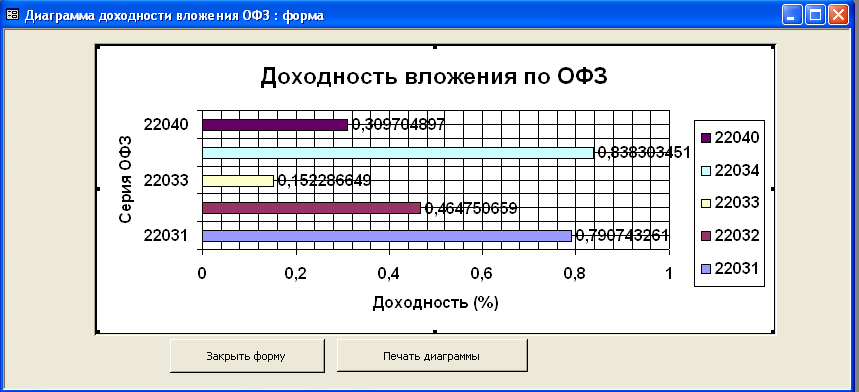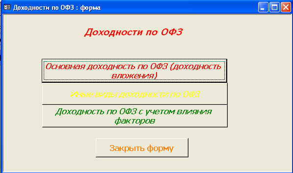 А. При выборе «Расчет основной доходности (доходности вложений ОФЗ)», осуществляется открытие формы «Доходность вложения по ОФЗ» (Приложение В.19), которая основывается на запросе «Доходность вложений ОФЗ» и имеет возможность просмотра отчета «Доходность вложений по ОФЗ» (Приложение Г.5). Также данная форма осуществляет просмотр диаграммы «Доходность вложений ОФЗ» (Приложение В.20). Б. При выборе «Иные виды доходности по ОФЗ» осуществляется переход на диалоговую форму «Иные доходности по ОФЗ» (Приложение В.21), с помощью данной формы выбираем необходимый вид доходности по ОФЗ: - «Купонный доход по ОФЗ» (Приложение В.22); - «Официальная доходность по ОФЗ» (Приложение В.23); - «Текущая доходность по ОФЗ» (Приложение В.24) Каждая форма основывается на одноименном запросе и имеет возможность просмотра отчета. В. При выборе «Доходность по ОФЗ с учетом факторов», осуществляется переход на диалоговую форму «Доходность по ОФЗ с учетом влияния факторов» (Приложение В.25), которая предоставляет возможность расчета полной доходности ОФЗ с учетом комиссионных (Приложение В.26). Данная форма основана на одноименном запросе.