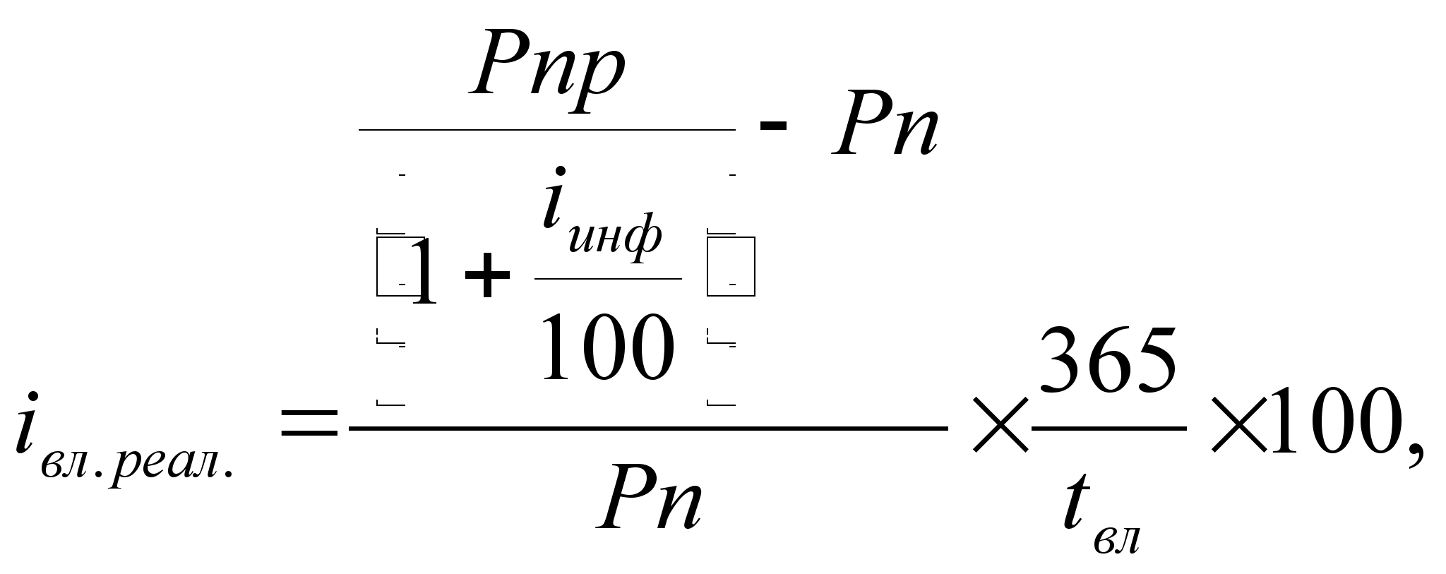 Показатель инфляции измеряется в процентах годовых и характеризует относительный прирост цен в экономике. Теперь рассмотрим, как изменятся формулы расчета доходностей с учетом инфляции. Будем исходить из уже сделанного нами предположения об обесценивании денег. Из данного утверждения следует, что покупательная способность суммы денег, которую мы выручили от продажи актива, не равна покупательной способности данной суммы в момент покупки актива. Для приведения покупательной способности полученной суммы необходимо произвести дисконтирование вырученных средств в соответствии с показателями инфляции. Тогда формула расчета реальной доходности вложения в ГКО примет следующий вид: