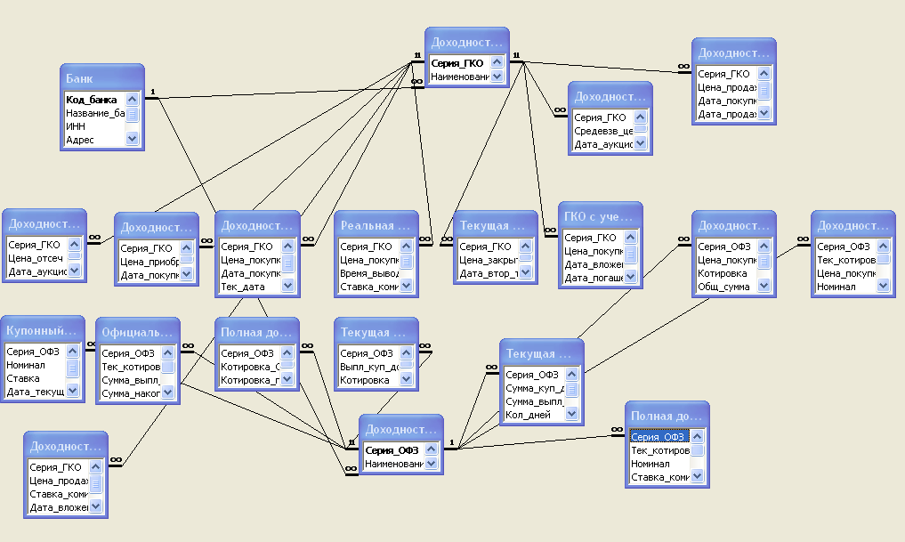 В таблице «Банк» существует первичный ключ «Код_банка», который связан с таблицами «Доходности по ГКО» и «Доходности по ОФЗ», в которых данный ключ является внешним, в свою очередь в таблицах «Доходности по ГКО» и «Доходности по ОФЗ» содержаться первичные ключи «Серия_ГКО» и «Серия_ОФЗ» соответственно. Ключ «Серия_ГКО» является внешним ключом для таблиц: - Доходность с учетом комиссионных; - Доходность вложения ГКО; - Доходность вложения ГКО с учетом комиссионных; - Доходность ГКО по средневзвешенной цене; - Доходность ГКО по цене отсечения; - Доходность покупки ГКО; - Доходность продаж ГКО; - Реальная доходность ГКО с учетом временных лагов; - Текущая доходность ГКО. Ключ «Серия_ОФЗ» является внешним ключом для следующих таблиц: - Доходность вложения ОФЗ; - Доходность вложения по ОГСЗ; - Купонный доход по ОФЗ; - Официальная доходность ОФЗ; - Полная доходность по ОГСЗ; - Полная доходность ОФЗ с учетом комиссионных; - Текущая доходность по ОГСЗ; - Текущая доходность по ОФЗ. Все вышесказанное отображено в на схеме данных. (Приложение А). 3.2 Реализация запросовТакже в программе содержатся запросы для выполнения необходимых вычислений, т. е. расчета доходностей на основании исходных данных представленных в таблицах. Запросы построены в конструкторе запросов. Листинг запросов приведен ниже: З SELECT [Доходность вложений ГКО].Серия_ГКО, [Доходность вложений ГКО].Цена_продажи, [Доходность вложений ГКО].Дата_покупки, [Доходность вложений ГКО].Дата_продажи, [Доходность вложений ГКО].Цена_покупки, (([Цена_продажи]-[Цена_покупки])/[Цена_покупки])*(365/([Дата_продажи]-[Дата_покупки])) AS [Доходность вложений ГКО] FROM [Доходность вложений ГКО]; апрос 1 – Доходность вложений ГКОВ Запросе 1 происходит расчет доходности вложений ГКО. Результат работы данного запроса отображен в Приложении Б.1 (см. п. п. 1.3.1 (21)) З SELECT [Полная доходность по ОГСЗ].Серия_ОФЗ, [Полная доходность по ОГСЗ].Котировка_ОГСЗ, [Полная доходность по ОГСЗ].Котировка_при_покуп, [Полная доходность по ОГСЗ].Кол_дней, (([Котировка_ОГСЗ]-[Котировка_при_покуп])/[Котировка_при_покуп])*365/[Кол_дней] AS [Полная доходность по ОГСЗ] FROM [Полная доходность по ОГСЗ]; апрос 2 – Полная доходность по ОГСЗРезультатом данного запроса является расчет полной доходности ОГСЗ (см. п.п. 1.3.2 (26)). Результат работы запроса приведен в Приложении Б.2. Запрос 3- Текущая доходность ГКО к погашению
