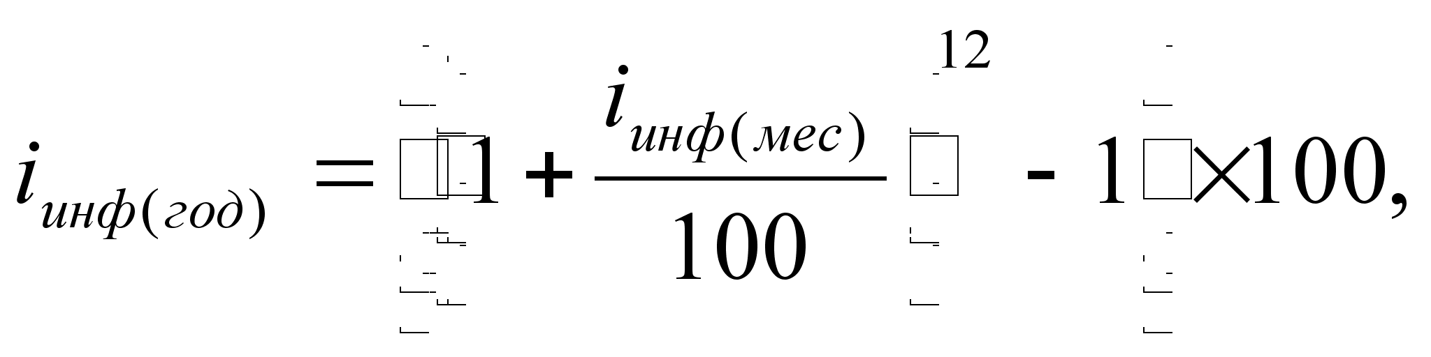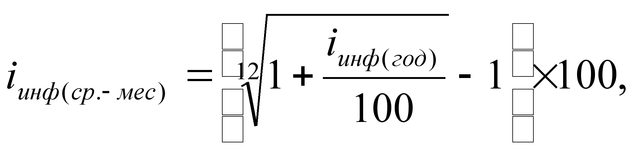 где iинф(год) – расчетное значение годового показателя инфляции; iинф(мес) – месячный показатель инфляции. При известном годовом показателе инфляции можно рассчитать его среднемесячное значение: