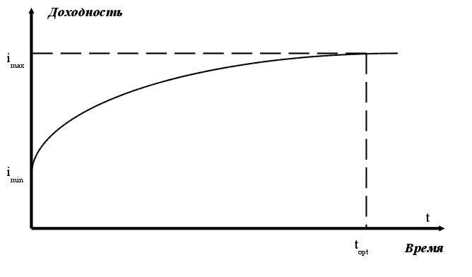 1.6 Кривая эффективной доходностиНа каждом сегменте финансового рынка существует зависимость между доходностью финансового инструмента и сроком до его погашения, причем такая зависимость стабильна только на одном сегменте и может иметь совершенно иные значения на другом. Эта зависимость получила название кривой эффективной доходности. В данном случае время погашения является мерой риска вложения в актив: чем дольше срок вложения, тем меньше уверенности, что должник вовремя и в полном объёме погасит долг, а соответственно больший риск инвестиций. На рисунке 1 приведена кривая эффективной доходности нормального вида. Рисунок 1 – Кривая эффективной доходности нормального вида