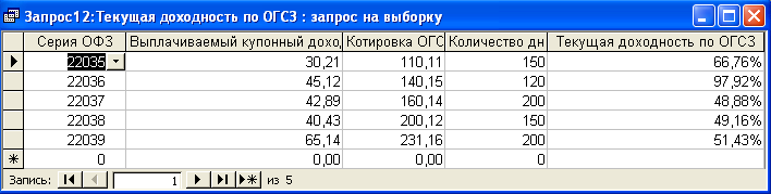 SELECT [Текущая доходность ГКО к погашению].Серия_ГКО, [Текущая доходность ГКО к погашению].Цена_закрытия, [Текущая доходность ГКО к погашению].Дата_втор_торг, [Текущая доходность ГКО к погашению].Дата_погаш, ((100-[Цена_закрытия])/[Цена_закрытия])*365/([Дата_погаш]-[Дата_втор_торг]) AS [Тек доходность к погашению] FROM [Текущая доходность ГКО к погашению]; Результатом данного запроса является расчет текущей доходности ГКО к погашению (см. п. п. 1.3.1 (15)). Результат работы запроса приведен в Приложении Б.3. З SELECT [Текущая доходность по ОГСЗ].Серия_ОФЗ, [Текущая доходность по ОГСЗ].Выпл_куп_дох, [Текущая доходность по ОГСЗ].Котировка, [Текущая доходность по ОГСЗ].Кол_дней, ([Выпл_куп_дох]/[Котировка])*365/[Кол_дней] AS [Текущая доходность по ОГСЗ] FROM [Текущая доходность по ОГСЗ]; апрос 4 - Текущая доходность по ОГСЗ Результатом работы данного запроса является расчет текущей доходности по ОГСЗ (см. п.п. 1.3.2 (24)). Результат работы запроса в Приложении Б.4. Запрос 5 - Текущая доходность по ОФЗ