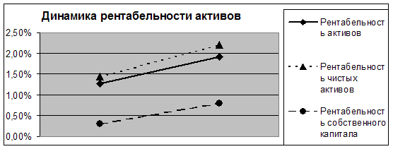 Анализ таблицы 2.16. и графика позволяет сделать следующие выводы: 1. За отчетный период рентабельность активов и рентабельность чистых активов выросли, что является положительной тенденцией. 2. Низкие значения рентабельности активов и рентабельности чистых активов характеризуют низкую эффективность использования активов компании. 3. Рентабельность собственного капитала характеризует прибыль, которая приходится на собственный капитал и в данном случае эта прибыль очень мала.
