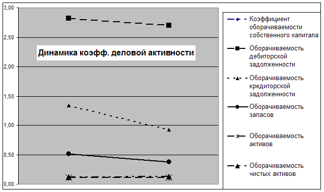Рис.3. Динамика коэффициентов деловой активности. На основании данных о коэффициентах деловой активности ООО ФТЦ «Нарспи» можно сделать следующие выводы: 1. Коэффициент оборачиваемости собственного капитала очень мал, что свидетельствует о бездействие части собственных средств, то есть о нерациональности их структуры; 2. Коэффициент оборачиваемости активов имеет также маленькое значение, что свидетельствует о медленной оборачиваемости капитала, вложенного в активы предприятия; 3. Значение оборачиваемости чистых активов показывает, что объем продаж не достаточно высок при данном количестве чистых активов и также он показывает, что чистые активы используются неэффективно, хотя рост показателя оборачиваемости активов говорит о повышении эффективности их использования; 4. Оборачиваемость дебиторской задолженности уменьшается с течением времени, но при этом его значение свидетельствует о положительных результатах при управлении текущими активами; 5. Небольшое значение коэффициента оборачиваемости кредиторской задолженности является хорошим результатом и, кроме того, значение коэффициента имеет тенденцию к уменьшению. 3. ВОЗМОЖНЫЕ РЕКОМЕНДАЦИИ ПО УЛУЧШЕНИЮ ФИНАНСОВОГО СОСТОЯНИЯ ООО ФТЦ «НАРСПИ»