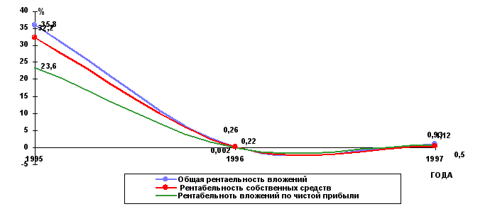 На основе данных таблицы можно сделать вывод о том, что если за 1996г. все показатели рентабельности вложений ООО «Никсвик» упали по сравнению с 1995г., то в 1997 году произошла противоположная ситуация. Все показатели рентабельности вложений увеличились. Общая рентабельность вложений в 1996г упала с 35,8% в 1995г. до 0,26%, в 1997 году возросла до 1,12%. То есть на 1руб. стоимости имущества предприятия в отчётном году приходилось 1,12 коп. балансовой прибыли. Значение данного показателя достаточно невелико для такого предприятия, что свидетельствует о недостаточно эффективном использовании активов предприятия в 1996г-1997г. На основе данных показателей рассчитываются показатели рентабельности вложений, которые представлены в таблице 17. Таблица 17 Показатели рентабельности вложения. (%)
