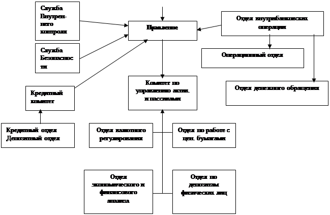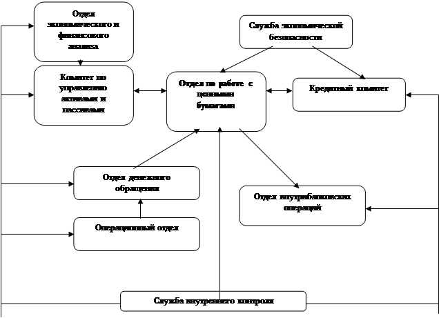 Рис. 3.1. Схема организационной структуры «Автогазбанка». Можно определить круг полномочий каждого подразделения, участвующего в исполнении операций с векселями. Отдел экономического и финансового анализа · -представляет предложения о процентных ставках для утверждения Комитетом по управлению активами и пассивами. Он в свою очередь, утверждает процентные ставки при выпуске Векселей и ставки досрочной оплаты Векселей. Отдел по работе с ценными бумагами · проводит предварительные переговоры и заключает сделки с клиентами; · оформляет распоряжение на выпуск Векселей; · формирует предложения в Комитет по управлению активами и пассивами по ставкам досрочного учета векселей; · доводит до заинтересованных подразделений утвержденные ставки; · оформляет выпускаемые в соответствии с Инструкцией Векселя; · получает и систематизирует информацию об операциях с Векселями, передаваемую из филиалов банка; · ведет единый реестр Векселей, выпущенных и банком и филиалами; · проводит переговоры с клиентами по оплате Векселей; · принимает Вексель у клиентов; · осуществляет проверку Векселей; · оформляет распоряжения в Отдел внутрибанковских операций на платеж по Векселям. · осуществляет контроль за соблюдением утвержденных Комитетом по управлению активами и пассивами процентных ставок и ставок досрочного выкупа; · осуществляет контроль за исполнением сделок; · осуществляет сверку данных с Отделом внутренних операций; · контролирует лимит на выпуск Векселей. Отдел внутрибанковских операций · осуществляет бухгалтерский учет операций с Векселями на основании распоряжения Отдела по работе с ценными бумагами; · осуществляет внебалансовый учет Векселей и выдает бланки Векселей уполномоченному сотруднику Отдела по работе с ценными бумагами. Отдел денежного обращения · получает типографические бланки Векселей, пересчитывает, проверяет их нумерацию и качество изготовления; · выдает бланки Векселей уполномоченному сотруднику Отдела по работе с ценными бумагами. Операционный отдел · принимает бланки погашенных Векселей; · получает и уничтожает испорченные бланки Векселей. Служба экономической безопасности · обеспечивает защиту экономических интересов банка при выпуске, продаже и погашении Векселей в случаях обнаружения недобросовестных или преступных действий клиентов и партнеров банка, а также при опасности возникновения таких действий. Служба внутреннего контроля · осуществляет контроль и проверку достоверности реестра Векселей; · оценивает качество текущего контроля и взаимодействия между подразделениями. Теперь следует показать технологическую связь взаимодействия отдела по работе с ценными бумагами с другими подразделениями банка (Рис. 3.2.).