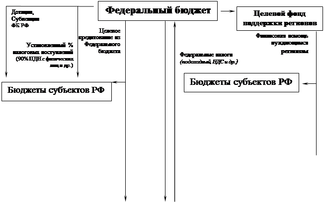 Из диаграммы становится видно, что бюджеты Субъектов Федерации несут более 48% расходов Государственной бюджетной системы. Основными статьями расходов являются обеспечение ЖКХ, государственное управление, дотирование сельского хозяйства и расходы на образование– вместе они составляют – 22,4% от всех расходов ГБС РФ. Кроме того, хотелось бы отметить явно положительный момент: увеличилась доля расходов на культуру, искусство, СМИ и здравоохранение, физическую культуру финансируемых за счет БСС РФ. Явный плюс, что средства будут распределятся более целенаправленно и равномерно. Однако планомерное выполнение своей роли БСС РФ может осуществлять лишь при хорошо скоординированном взаимодействии с бюджетами других уровней. И здесь как никогда важным становится процесс межбюджетного регулирования. 2. Взаимодействие БСС РФ с Федеральным и местными бюджетами. Межбюджетное регулирование - это предоставление финансовой помощи одним бюджетом другому в различных формах…[9] Такое регулирование выступает как форма взаимодействия БСС РФ с государственным и местными бюджетами. Можно выделить несколько основных актуальных форм: - Дотации. - Субвенции. - Бюджетные ссуды. - Отчисления от регулирующих налогов и доходов. - Трансферты. Рассмотрим подробнее каждую из них. Дотации - самая простая форма: для сбалансирования из Федерального бюджета предоставляется бюджетам Субъектов Федерации и местным сумма (абсолютная) средств. Вообще, эта форма самая несовершенная, так как располагает к иждивению. Субвенции - целевая дотация бюджету для финансирования определенных мероприятий (Большое практическое применение получила в США и Великобритании). Это более прогрессивная форма, которая, в принципе, может предоставляться на долевых началах. Бюджетные ссуды – это предоставление средств на возвратной основе под небольшой процент. Более развито на уровне ГБС – БСС РФ, нежели на уровне БСС РФ - местные бюджеты. Отчисления от регулирующих налогов и доходов - наиболее распространенная до последнего времени форма. Механизм ее реализации заключается в следующем: с налогов, поступающих в вышестоящий бюджет, устанавливается определенный процент отчислений в соответствующий территориальный бюджет. Этот способ должен был стимулировать изыскание дополнительных средств для роста сбора налогов, однако на практике региональные бюджеты стремились повысить ставку отчисляемого процента, а не искать средства, вследствие того, что процент отчислений устанавливается в большей мере виртуально, свой для каждого региона. Трансферты – это достаточно новый для нашей страны механизм – т.н. бюджетный федерализм, заимствованный у Германии. В этом случае распределение средств производится при помощи трансфертов (трансферт, трансфер – банковские операции по переводу иностранной или национальной валюты как внутри страны, так и за ее пределы[10]). Финансовая помощь предоставляется за счет специально создаваемого фонда финансовой поддержки регионов (внутри его - фонд для особо нуждающихся) - в эти фонды направляется примерно 15% всех собираемых налогов и сборов, кроме таможенных пошлин.