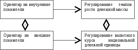 Денежно-кредитную политику следует рассматривать в широком и узком смысле. В широком смысле она направлена на борьбу с инфляцией и безработицей, на достижение стабильных темпов экономического развития через регулирование денежной массы в обращении, ликвидности банковской системы, долгосрочных процентных ставок. В узком смысле такая политика направлена на достижение оптимального валютного курса с помощью валютной интервенции, проведения учетной политики и других методов регулирования краткосрочных процентных ставок. Под валютной интервенцией понимается политика купли-продажи центральным банком иностранной валюты на национальную на валютном рынке. Одним из основных принципов определения стратегии центральных банков служит ориентация на регулирование темпа роста денежной массы в национальной экономики или регулирование валютного курса национальной денежной единицы по отношению к какой-либо стабильной иностранной валюте т.е. на внутренние или внешние показатели (рис 1)7.