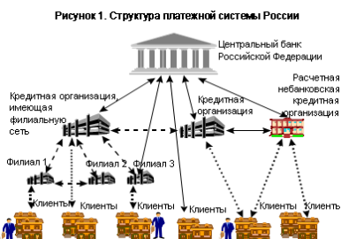 Платежная система – это совокупность инструментов и методов, которые применяются в хозяйстве для перевода денег и осуществления расчетов между юридическими и физическими лицами. Она находится под общим руководством Центрального банка РФ, который в соответствии с законодательством обеспечивает ее эффективность, стабильность, надежность и безопасность. Центральный банк РФ занимает особое место в платежной системе России. Банк России, являясь оператором собственной платежной системы, координирует и регулирует расчетные отношения в России, осуществляет мониторинг деятельности частных платежных систем, определяя основные положения их функционирования, устанавливает правила, формы, сроки и стандарты осуществления безналичных расчетов. Кроме того, Банк России разрабатывает порядок составления и представления статистической отчетности, характеризующей платежную систему России, с целью повышения ее прозрачности. К правовой базе регулирования платежной системы России относятся Гражданский кодекс Российской Федерации, Федеральные законы Российской Федерации, основными из которых являются Федеральные законы «О Центральном банке Российской Федерации (Банке России)» и «О банках и банковской деятельности», а также принятые в соответствии с ними нормативные акты Банка России. В 2002 году утверждена новая редакция Положения Банка России «О безналичных расчетах в Российской Федерации» № 2-П, в которой уточнен порядок расчетов платежными требованиями, оплачиваемыми с акцептом, а также дано определение окончательности и безотзывности платежей, которое позволит исключить финансовые риски участников и обеспечить еще более высокую степень надежности платежной системы. В целях совершенствования организации наличного денежного обращения и регулирования расчетов наличными деньгами в 2002 году Банком России совместно с Министерством Российской Федерации по налогам и сборам давались разъяснения, касающиеся установленного Банком России предельного размера расчетов наличными деньгами между юридическими лицами. Структура платежной системы России приведена на рис. 1