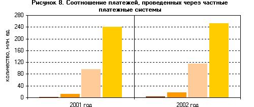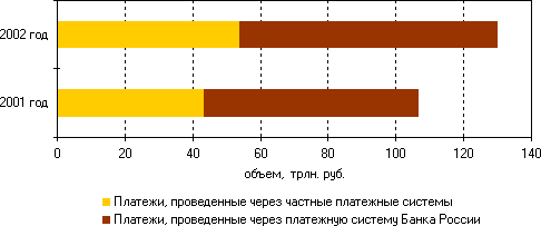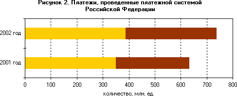. Клиентами Банка России являются кредитные организации и их филиалы, которым открыты корреспондентские счета (субсчета) в Банке России. Многофилиальные кредитные организации для осуществления расчетов между филиалами открывают счета межфилиальных расчетов. Межбанковские расчеты между кредитными организациями совершаются через корреспондентские счета, открываемые друг у друга. В расчетных небанковских кредитных организациях участниками расчетов являются как кредитные организации, так и юридические лица, не являющиеся кредитными организациями. Клиентам - юридическим и физическим лицам - для осуществления безналичных расчетов открываются счета в кредитных организациях, а в отдельных случаях, установленных законодательством, юридическим лицам открываются счета в учреждениях Банка России Участниками платежной системы России являлись (данные на 01.01.2003) 1172 учреждения Банка России, 1331 кредитная организация, в том числе 41 расчетная небанковская кредитная организация, 3326 филиалов кредитных организаций. Кроме того, расчетное обслуживание клиентов осуществляли 6387 дополнительных офисов кредитных организаций. Участниками платежной системы России открыто клиентам (резидентам и нерезидентам) 271,4 млн. банковских счетов в валюте Российской Федерации, в том числе юридическим лицам, не являющимся кредитными организациями, - 4,2 млн. счетов (1,6%), физическим лицам - 267,2 млн. счетов (98,4%), из которых большинство счетов - 90,1% - в Сберегательном банке Российской Федерации. Количество банковских счетов в расчете на одного жителя в среднем по России составило 1,9 счета. Участниками платежной системы России открыто клиентам (резидентам и нерезидентам) 271,4 млн. банковских счетов в валюте Российской Федерации, в том числе юридическим лицам, не являющимся кредитными организациями, - 4,2 млн. счетов (1,6%), физическим лицам - 267,2 млн. счетов (98,4%), из которых большинство счетов - 90,1% - в Сберегательном банке Российской Федерации. Количество банковских счетов в расчете на одного жителя в среднем по России составило 1,9 счета. В среднем по Российской Федерации количество жителей, приходящихся на одного участника платежной системы России, составило 24,7 тысячи человек, а количество юридических лиц - 660. В то же время, с учетом дополнительных офисов, открытых кредитными организациями (филиалами), данные показатели соответственно составили 11,8 тысяч жителей и 315 юридических лиц. В 2002 году платежной системой России проведено 737,9 миллионов платежей на сумму 130,1 трлн. рублей. Увеличение по сравнению с 2001 годом объема платежей составило 22,0%, что выше уровня инфляции в стране. Это, а также количественный рост платежей на 16,5%, явилось следствием подъема деловой активности хозяйствующих субъектов. В 2002 году практически не изменилось соотношение безналичных платежей, проведенных платежной системой Банка России и частными платежными системами в платежной системе страны (рисунок 2).