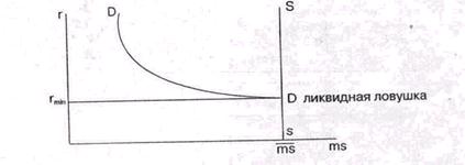 Рис. 5. Ликвидная ловушка. За этой точкой равновесие рынка невозможно, так как при дальнейшем росте предложения денег норма ссудного процента не будет снижаться, количество денег в обращении будет расти, что означает инфляцию. Поэтому условием краткосрочного равновесия на рынке денег является неравенство: ms < mš. В 1994 - 1996 гг. в России спрос на деньги опережал предложение денег (табл. 3), что вело к росту цены денег - ссудного процента. Среднегодовая величина реальной процентной ставки по операциям межбанковских кредитов в 1996 г составила 32 % против 16% в 1995 г.