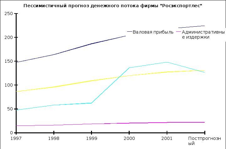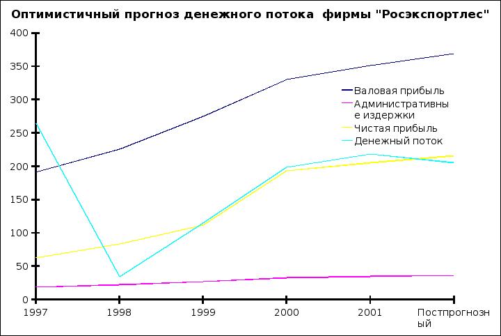 Главным результатом коммерческой деятельности является получение дохода. Поэтому доходный подход к оценке бизнеса позволяет определять рыночную стоимость фирмы в зависимости от ожидаемых в будущем доходов. Сумма будущих доходов является ориентиром того, насколько готов заплатить за оцениваемую фирму будущий инвестор. Основным показателем метода доходного подхода является чистый денежный поток, который определяется, как правило, в виде денежных средств за определенный промежуток времени. При определении денежного потока фирмы: «Росэкспортлес» была применена следующая формула: (Чистая прибыль + Износ + Увеличение долгосрочной задолженности) - (Прирост собственного оборотного капитала + Капитальные вложения + Уменьшение долгосрочной задолженности) = Денежный поток. На первом этапе был определен общий объем выручки и совокупные затраты, что позволило рассчитать показатель балансовой прибыли, из суммы которой была вычтена сумма налогов с учетом показателя налогообложения (35%) и получен размер чистой прибыли. Для выработки рекомендаций по мониторингу коммерческой деятельности денежные потоки рассматривались за два периода: прогнозный и постпрогнозный. Прогнозный период с учетом пожеланий руководства фирмы «Росэкспортлес» был определен сроком в пять лет. Выручка и совокупные текущие затраты рассматривались по каждому виду лесопродукции, а от сдачи помещения фирмы в аренду. Для расчета денежного потока были предусмотрены два прогноза: оптимистический и пессимистический. При оптимистическом прогнозе: фирма получает кредит в размере 300 тыс.долл. Сроком на три года под 25% годовых. При пессимистическом прогнозе исходили из условия, что кредит отсутствует. Распределение капитальных вложений по годам: первый год — 50 тыс.долл., во второй — 50 тыс.долл., в третий — 60 тыс.долл. Коэффициент общего износа здания был принят 10%. Совокупные издержки на базе анализ трех лет с 1994-1996 гг. были приняты на уровне 10% объема балансовой прибыли. Ставка налога на балансовую прибыль была принята 35%. Требуемый собственный капитал составил 23% общего объема выручки. Расчет денежного потока только по одной номенклатурной позиции (деловой древесине, выбранной в качестве примера) с учетом прогноза будущих доходов представлен в табл. 2. Расчет денежного потока, тыс.долл. Таблица 4.