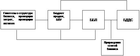 Рис. З. Схема действий при долгосрочном финансовом планированииДолгосрочное финансовое планированиеОднако в случае долгосрочного планирования построение детального набора операционных бюджетов бывает затруднено как из-за большого объема детальной прогнозной информации, которая просто отсутствует, так и из-за громоздкости самой процедуры построения детальных бюджетов затрат. В этом разделе мы рассмотрим самый распространенный и простой способ долгосрочного прогнозирования финансовой отчетности, использующий гипотезу прямой пропорциональности статей затрат и многих статей баланса объему продаж. Такая гипотеза является достаточно справедливой в случае долгосрочного планирования (1–2-3 года), когда даже условно-постоянные затраты можно считать в значительной степени переменными. Построение БПУ при гипотезе пропорциональности затрат объему продаж.