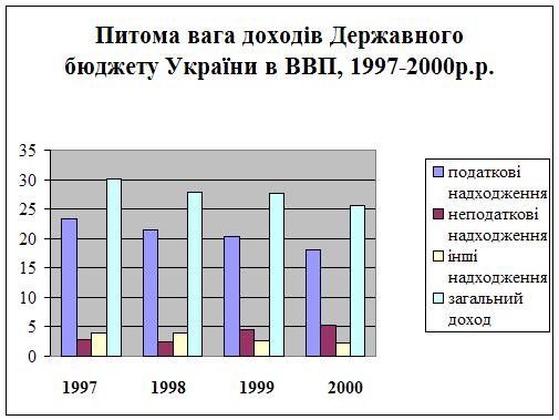 Реферат: Доходы государственного бюджета УкраиныРеферат: Доходы государственного бюджета УкраиныПлан.Вступ. 1. Соціально-економічна суть, призначення і роль доходів Державного бюджету України. 2. Аналіз складу і структури доходів Державного бюджету України та особливості їх формування. 3. Удосконалення чинної системи доходів Державного бюджету України. Висновки і пропозиції. Список використаних джерел. ВСТУП Сукупність фінансових інститутів, що об'єднують визначені фінансові відношення по утворенню і використанню відповідних централізованих і децентралізованих фондів коштів, являє собою фінансову систему України. У умовах переходу до ринкової економіки всім інститутам фінансової системи додається велике значення, тому що, вони вносять визначений внесок у розвиток економіки держави. Однак, в інститутах, де фінансові відношення регулюються нормами, не погодженими з діями економічних законів, або суміжними фінансовими інститутами, вони створюють передумови або безпосередньо діють на поглиблення економічної кризи. В даний час такими інститутами є інститути банківського кредитування, державного бюджету, а також діюча система безготівкових розрахунків, як усередині країни, так і в розрахунках із закордонними країнами. Різноманітна фінансова діяльність в Україні, регульована нормами різних фінансових інститутів будується на економічній основі держави. Фінансова діяльність спрямована на забезпечення функцій держави, це його бюджет. Бюджет - це план створення і використання фінансових ресурсів для забезпечення функцій, здійснюваних органами державної влади України, органами влади Автономної Республіки Крим і місцевими Радами народних депутатів. Державний бюджет України затверджується законом України. Головне місце у фінансовій системі України займає державний бюджет України і місцеві бюджети місцевих рад народних депутатів. Державний бюджет - розпис прибутків і витрат держави на визначений період (на рік). Являють собою централізовані фонди коштів, акумульовані, головним чином, за допомогою податків і використовувані для державного регулювання економіки, стимулювання господарської кон'юнктури, фінансування соціальних програм, науки і культури, збройних сил, утворення фінансових і матеріальних резервів, утримання органів державного керування. Державний бюджет України є загальнодержавним централізованим фондом коштів, що стверджується актом вищої юридичної чинності, законом. Бюджет будується на принципах цілісності, повноти, достовірності, гласності, наочності і самостійності всіх бюджетів, що входять у бюджетну систему України. 1. Соціально-економічна суть, призначення і роль доходів Державного бюджету України. Доходи бюджету - це частина централізованих фінансових ресурсів держави, необхідних для виконання його функцій. Вони виражають економічні відносини, які виникають у процесі формування фондів грошових ресурсів і поступають у розпорядження органів влади різних рівнів. Доходи як економічна категорія виражають економічні відносини, які виникають у держави з юридичними та фізичними особами в процесі формування бюджетного фонду держави. Формою прояву категорії доходи бюджету служать податки, збори, платежі і відрахування. Доходи бюджету - поняття більш вужче, ніж доходи держави; поряд із фін