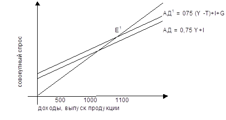 Государственные расходы возрастают с нуля до 100, и одновременно на 100 единиц увеличиваются налоги. Кривая АД перемещается вверх на 25 пунктов. Новая кривая совокупного спроса АД1 пересекает биссектрису системы координат в точке Е1. Это означает, что равновесный уровень доходов теперь выше, чем он мог бы быть при полном отсутствии государственных расходов и налогообложения. Новый равновесный уровень доходов равен 1100(1000 +4*25). Наши рассуждения предполагают, что величина прироста равновесного уровня доходов может быть вычислима с помощью стандартной формулы мультипликатора: мультипликатор – прирост расходов при исходном, первоначальном уровне доходов. Данный пример является хорошей иллюстрацией особого варианта фискальной политики: фискального расширения сбалансированного бюджета, когда и налоги и правительственные расходы увеличиваются на одинаковую величину. В этом случае мы получаем знаменитый эффект действия мультипликатора сбалансированного бюджета. Мультипликатор сбалансированного бюджета устанавливает, что прирост правительственных расходов, сопровождаемый равными по величине приростом налогов – имеет своим результатом увеличение выпуска продукции. Причина того, почему объем выпуска продукции увеличивается (вместо того, чтобы оставаться неизменным), состоит в том, что прирост государственных расходов приводит к незамедлительному увеличению совокупного спроса на величину этого прироста, в то время как прирост налогов, как только что могли видеть в приведенном примере, сокращает уровень потребительского спроса на гораздо меньшую величину. Эти два эффекта взятые вместе, действительно приводят к увеличению совокупного спроса и, следовательно, являются причиной роста выпуска продукции. При неизменном данном уровне инвестицией результат действия