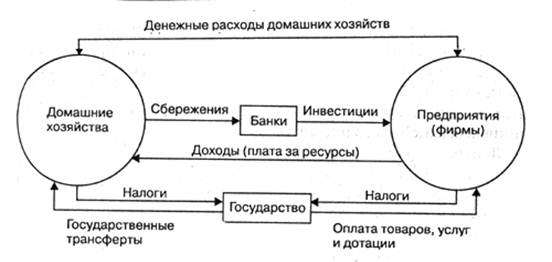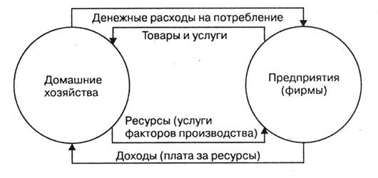 Инвестиции - это затраты, направляемые на увеличение или восполнение капитала, то есть для получения прибыли или получения полезного эффекта. Они делятся на три части: инвестиции в финансовые активы (ценные бумаги, займы); инвестиции в запасы материальных оборотных средств (сырье, готовая продукция); инвестиции в основной капитал, т.е. в машины, здания, или, в тот реальны капитал, который служит более долго. В свою очередь, эти капиталовложения включают затраты как на возмещения, так и на прирост основного капитала. Амортизация-это инвестиционные расходы, которые направляются на возмещение износившихся машин, оборудования, на восполнение отслуживших свои сроки здания. Эти расходы представляют собой денежные средства, характеризующие перенесение стоимости средств труда на создаваемый с их помощью продукт.Чистые инвестиции - это ресурсы для строительства новых предприятий, создание нового оборудования и др. Валовые инвестиции минус амортизация дают величину чистых инвестиций.3. Кругооборот товаров и услуг Экономика России — это более двух миллионов предприятий, учреждений, различных организаций, десятки миллионов домашних хозяйств. Между ними сложная система связей, которую нелегко представить, даже имея в распоряжении подробные данные. статистические справочники. Во всей этой необычайно разветвленной и неоднородной, находящейся в постоянном движении экономической деятельности трудно разобраться и опытному специалисту, и тем более рядовому участнику. Отсюда вытекает необходимость сделать скрытые связи прозрачными, сложные — простыми, сгруппировать v укрупнить, или, как выражаются экономисты, агрегировать, однородные и сходные связи. В агрегировании экономических отношений заключается одна из задач макроэкономики. Для начала представим самую простую картину экономических связей — укрупненную схему движения товаров и доходов продукции и денег. Упрощенная схема кругооборотаВначале в ней будут присутствовать лишь две основные хозяйственные единицы: домашние хозяйства и предприятия. Мы абстрагируемся от внешних связей. Лишь позже привлечем в качестве участников экономического процесса государство и банковскую систему. В упрощенной схеме агрегируем «ручейки» и «реки» разнообразных товаров и услуг, расходов и доходов в однородные «потоки», протекающие между предприятиями и домашними хозяйствами, объединяющие их в хозяйственную систему (рис.1).