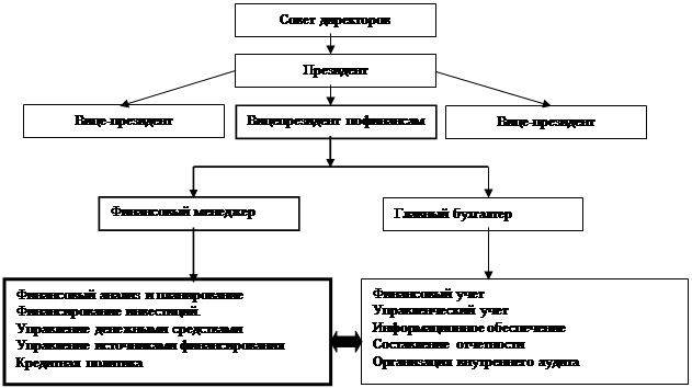 Любая организационная структура, под влиянием различных факторов может претерпевать различные изменения. Это особенно актуально в современных условиях. Однако, в процессе модификации, необходимо придерживать следующих основных принципов: - Принцип эффективности организации управления. - Принцип финансового контроля или внутреннего аудита. - Принцип финансового стимулирования. - Принцип материальной ответственности. Принятие во внимание указанных выше положений, при изменении или создания новой структуры управления финансами, может минимизировать риски, с которым связанна подобная реорганизация. Особую важность, в системе организации деятельности финансовой службы, имеет деление оборотных средств на собственные и заемные. К собственным денежным средствам, принято относить средства, которые закреплены за предприятием в бессрочное пользование, заемные средства – это в основном банковские кредиты – предоставляются предприятию на относительно небольшой срок и с определенной целью. Деление оборотных средств на собственные и заемные связанно, прежде всего, с тем, что у предприятия в отдельные периоды возникает повышенная потребность в дополнительных финансовых ресурсах, например в связи с сезонным характером производства и реализации продукции. Для ее покрытия иногда целесообразно использовать краткосрочные банковские кредиты. Сочетание собственных и заемных средств позволяет более рационально использовать оборотные средства. Для обеспечения нормальной деятельности предприятия, создаются, (Как правило, за счет чистой прибыли) различные целевые фонды денежных средств. Это повышает устойчивость предприятия к неожиданным изменениям внешней среды, способствует плавному выходу из возможных кризисов. К основным фондам относят: - Фонд основных средств; - Фонд оборотных средств; - Финансовый резерв; - Фонд амортизации; - Различные страховые фонды; - Фонд развития; - Фонд потребления; - Фонд нераспределенной прибыли. 1.2 Организация управления финансами. За финансовую работу на предприятиях, в соответствии с Гражданским Кодексом, отвечает директор. За управление финансами отвечает назначенный финансовый директор или главный бухгалтер. Исходя из экономической целесообразности, указанные должностные лица, определяют структуру и основные задачи для вновь создаваемого подразделения. Финансовый отдел может быть организован как в рамках бухгалтерской службы, так и выделен в отдельное подразделение. На крупных предприятиях принято создавать специальные службы: выделяя специалистов по управлению оперативным, текущим и стратегическим денежным потокам. Основой организации финансов предприятия является наличие финансовых ресурсов, в размерах, необходимых для осуществления организации хозяйственной и коммерческой деятельности предприятия. Первоначальное формирование этих ресурсов, производится в период создания предприятия (реорганизации), путем образования уставного фонда, как правило, изначально подразделяющегося на основные и оборотные средства. Источником образования уставного фонда могут быть: акционерный капитал, собственные средства предпринимателя, кредиты, бюджетные средства и др. В последствии, когда предприятие начинает реализовывать, задачи, ради которых оно было образованно, ресурсы распредел
