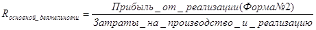 (2.1.4-4) В среднем, у стабильно работающего предприятия, этот показатель варьируется от 0,05 до 0,1. 2.1.5 Анализ финансовых результатов и коэффициентов рентабельности В проведения анализа доходности и рентабельности предприятия заинтересованы многие категории пользователей. В зависимости от целей финансового анализа, можно рассчитывать различные показатели рентабельности работы предприятия. Однако к основным принято относить: из абсолютных – выручка от реализации, балансовая прибыль, чистая прибыль. (Для расчета используются данные формы №1) Они характеризуют абсолютную эффективность хозяйственной деятельности. Из относительных - рентабельность основной деятельности, рентабельности совокупного, инвестированного и собственного капитала. Рентабельность основной деятельности.
