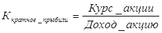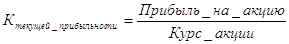 ( 2.1.7-2) Данный коэффициент, показывает, во сколько раз, доход на акцию превышает ее рыночный курс. То есть отражает оценку рынка качество доходов компании. Если умножить этот показатель на норму рентабельности (см. выше), то получится коэффициент «кратное прибыли за реализованную продукцию». По данному показателю, возможно, определить компании, терпящие убытки. Сравнивая, например, со средними значениями по отрасли, выявить более низкий уровень этого коэффициента. Текущая прибыльность акций - показывает какой доход в данный момент обеспечивает владельцу акции владение этой ценной бумагой.
