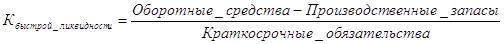 (2.1.4-2) Дает общую оценку ликвидности активов, показывая, сколько рублей текущих активов приходится на один рубль текущих обязательств. Логика исчисления данного показателя заключается в том, что предприятие погашает краткосрочные обязательства в основном за счет текущих активов; следовательно, если текущие активы превышают по величине текущие обязательства, предприятие может рассматриваться как успешно функционирующее. Значение показателя может быть различным по отраслям и видам деятельности, а его разумный рост в динамике обычно рассматривается как благоприятная тенденция. В западной учетно-аналитической практике приводится нижнее критическое значение показателя - 2; однако это лишь ориентировочное значение, указывающее на порядок значений, но не на его точное нормативное значение.