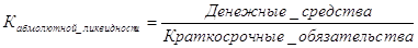 Коэффициент быстрой ликвидности ( 2.1.4-3) Выводясь по более узкому кругу оборотных средств, данный показатель по содержанию аналогичен предыдущему. Рекомендуемый минимум единица. Коэффициент абсолютной ликвидности - самый жесткий критерий ликвидности предприятия. Он показывает какая часть краткосрочных обязательств, может быть погашена немедленно, за счет денежных средств и их заменителей.