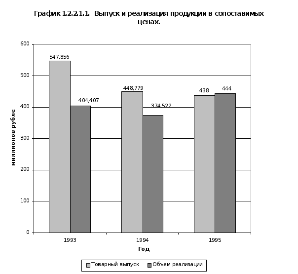 Из данных таблицы 1.2.2.1.3. следует, что план по объему производства продукции в 1995 году выполнен на 101,1%, а по ассортименту на 99,82%. Причиной расхождения между исчисленными процентами явилось невыполнение плана по выпуску: